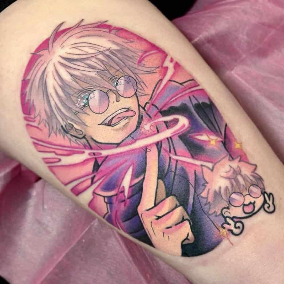 Gojo’s that character who can be both a walking meme and a walking catastrophe, and honestly that’s why his tattoos are so fun. You can go silly and minimal — like a playful little sketch that says, “I love this guy” without shouting it — or go full cinematic with saturated colors and magical linework that looks like it’s vibrating off the skin. Some designs lean into his intimidating power, showing fierce expressions and dramatic shading to remind you of inner strength; others focus on the tiny details that make him Gojo, like that shock of blue in his eyes or the moment he pulls off his blindfold. And then there are pieces that mix both sides: a crisp, clean face with delicate outlines and a tiny chibi-Gojo tucked in for personality. Honestly, there’s no wrong way to channel his energy — you just pick the mood you want to wear.