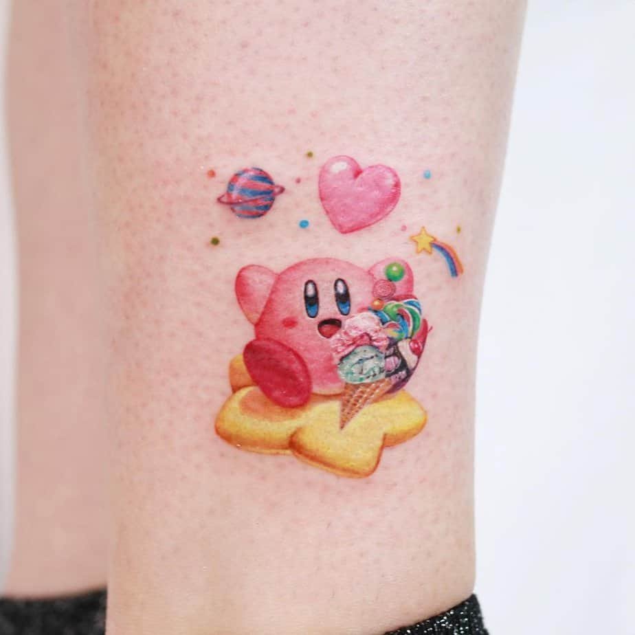 This leg tattoo imagines Kirby as a fridge with a strawberry cake inside — a playful nod to his insatiable appetite. It’s quirky, creative, and the kind of design you can’t help but grin at.