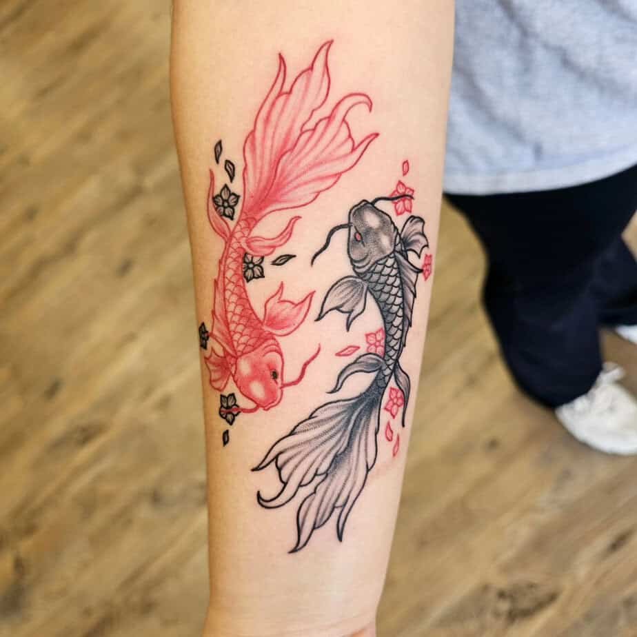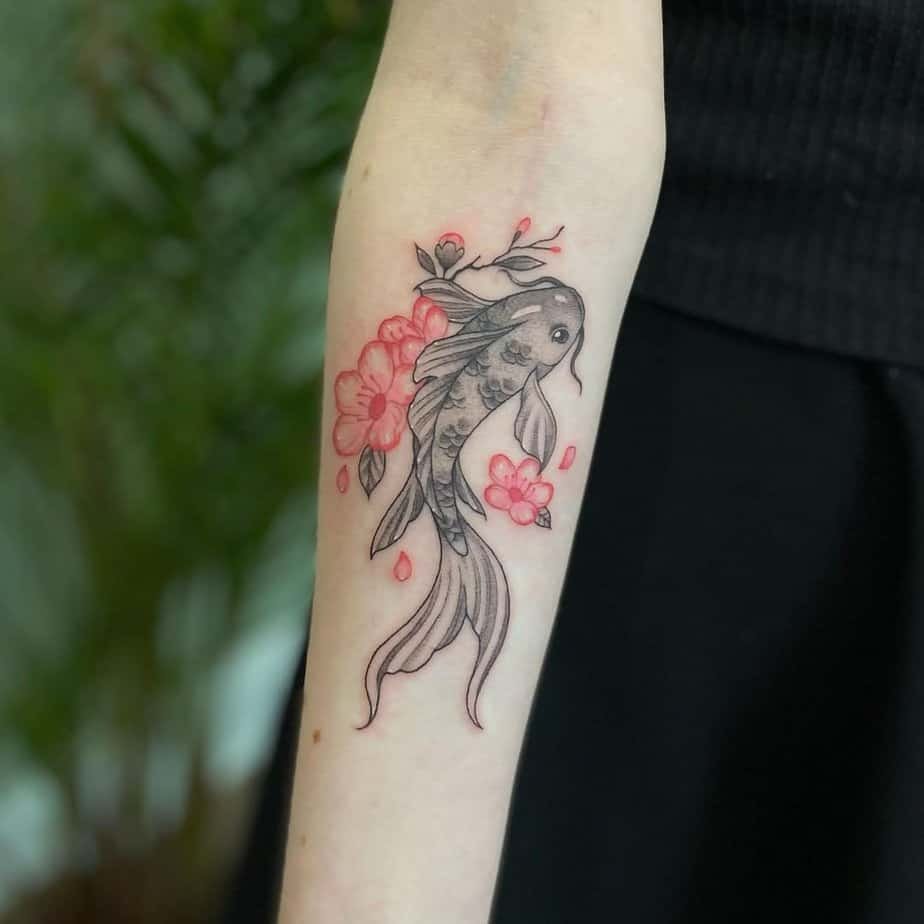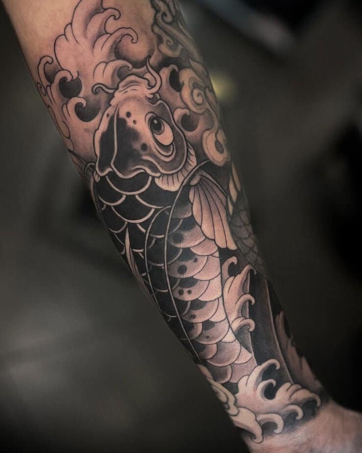 If you want to look like a little bit of a badass without shouting, this black-and-gray koi on the forearm is giving exactly that. The lines are intricate and so precise it almost reads like a sketch come alive. Koi are famous for their resilience — literally built to push through currents — so wearing one feels like a quiet reminder: you can get through hard things. Maybe this tattoo would be your first little promise to yourself to face fears head-on.