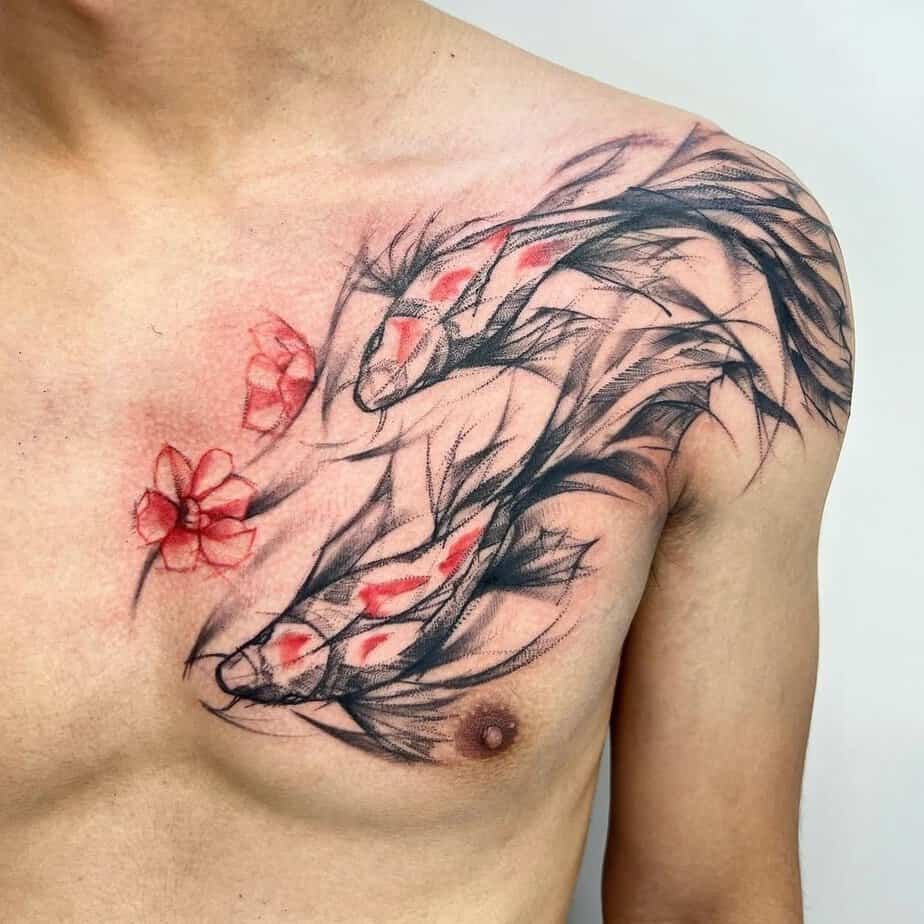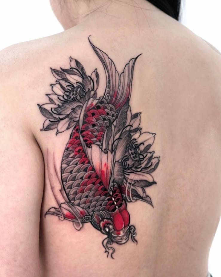 Want intimidating? This black-and-gray koi with splashes of red reads fierce. The red reads like a call to persevere — not sinister, just urgent. Placed on the left side of the back, it’s confident and kind of badass.