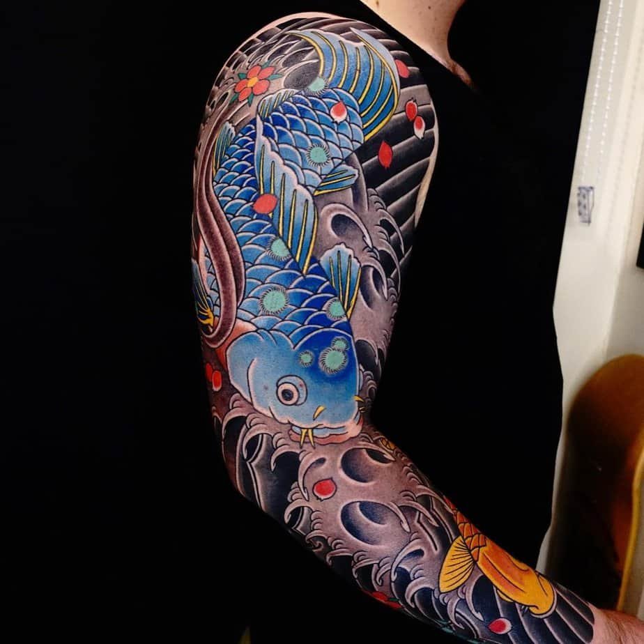 A full sleeve is an option when you want something bold and immersive. Bright koi colors against dark backgrounds make the fish pop, and the contrast can feel like a visual reminder: you’re moving through shadow but still vibrant.