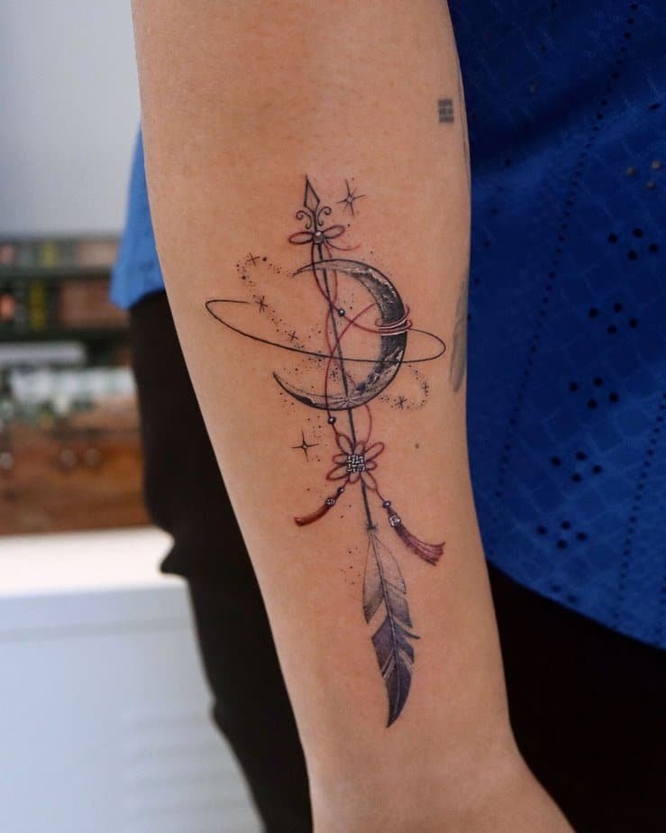 A feather arrow tied with a red string and a crescent moon — it’s poetic. The arrow points you toward your goals, the moon nods to intuition and growth, and the red string ties those threads together into a tiny narrative about pursuing your path.