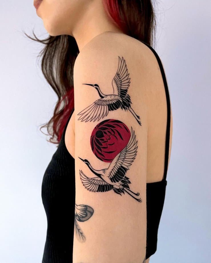 Okay, picture this: two black-and-gray cranes drifting around a red moon. Cranes are classic good-luck symbols, like a quiet invitation for happiness to show up, and that red moon? It reads like transformation — the kind that follows deep grief and comes out softer on the other side. It’s a really pretty pick if you want something hopeful and a little poetic.
