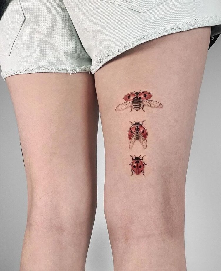 If you love bold lines and a classic palette, a traditional-style ladybug on the knee or thigh has big vintage energy. It’s playful and rooted in tattoo history.