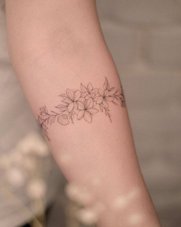 This forearm bracelet of plumerias has that feminine, elegant energy — black-and-gray tones with subtle dotwork that feel classy and soft at once. It’s the kind of piece that nudges you toward balance and calm every time you glance at it.
