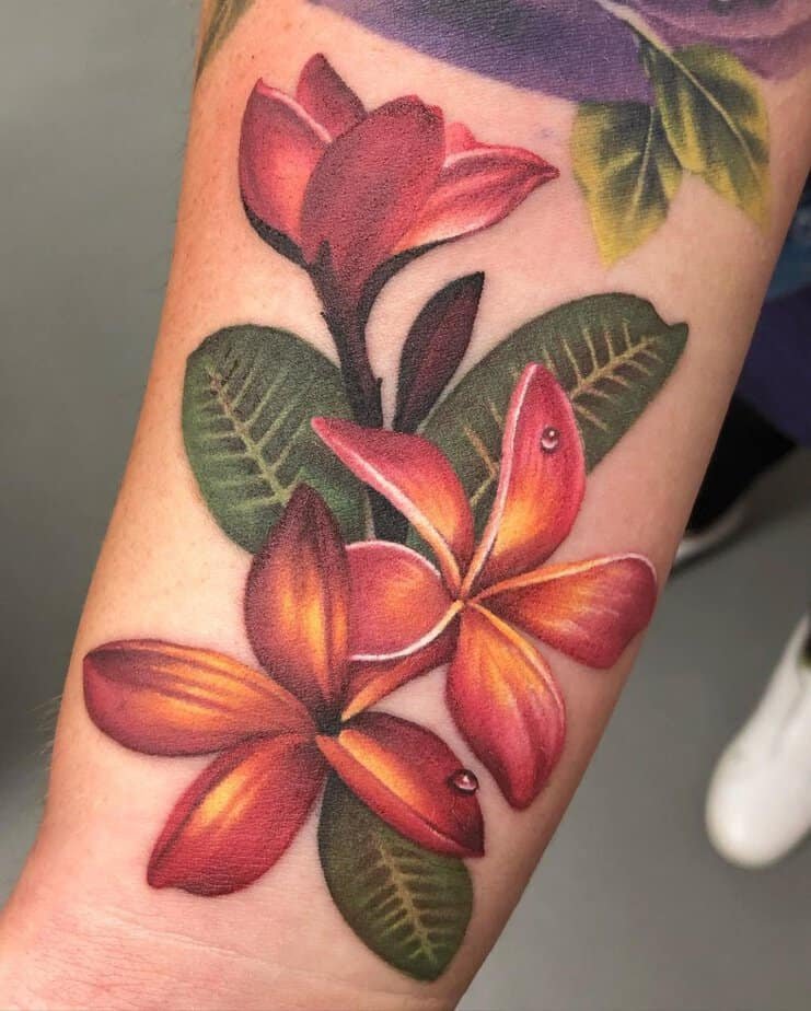 If you’re drawn to the quieter, deeper side of things, this forearm plumeria in vibrant purples (with little pops of white and yellow) might be your thing. Purple plumerias whisper wisdom and the urge to know yourself better — so it’s beautiful and meaningful at the same time.