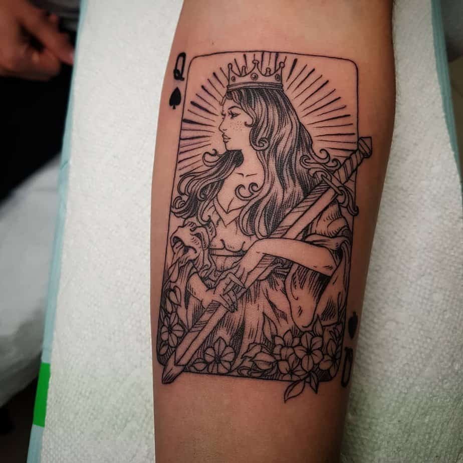 This one portrays the Queen of Hearts as a straight-up fighter — sword, crown, the whole mythic vibe. The shading and linework give her an almost goddess-like presence, the kind that reminds you to stand tall when life tries to knock you down. If you see yourself as a survivor or a warrior, this tattoo reads like a personal talisman.