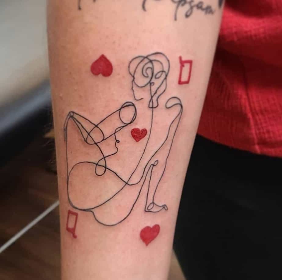 If you love subtlety, this single-line Queen with tiny red hearts is gorgeous. It’s simple but still unmistakable, the kind of piece that whispers rather than shouts. Small, elegant, and modern — a perfect pick for anyone who prefers a lighter touch that still carries meaning.