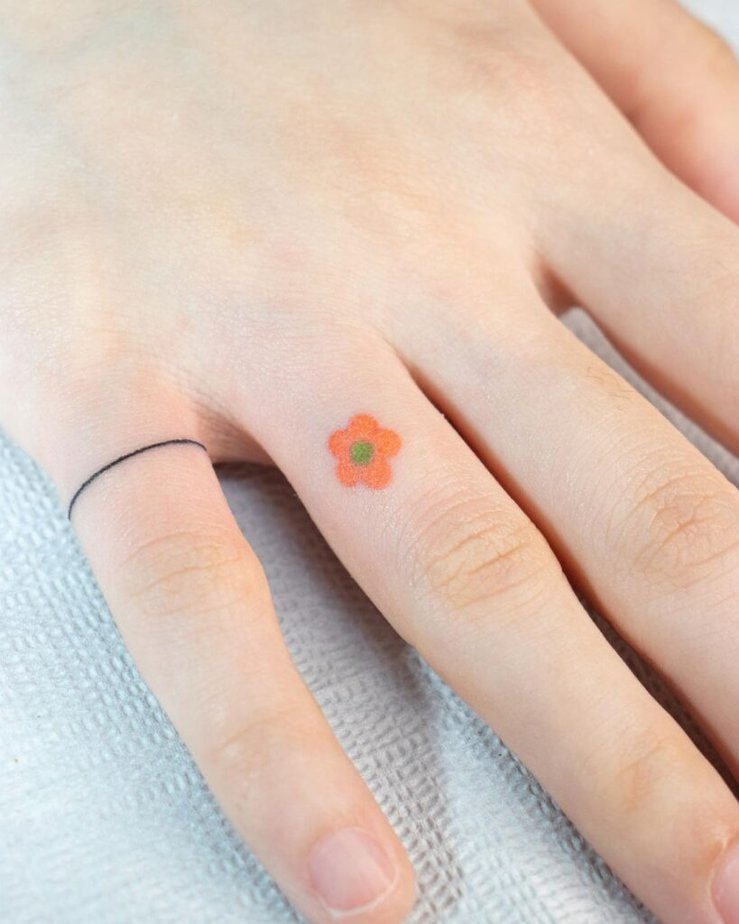 If you want something sweet and a bit whimsical, try a tiny cartoon-style flower paired with a clean line. It's youthful, playful, and easy to layer with other small finger tattoos if you want.