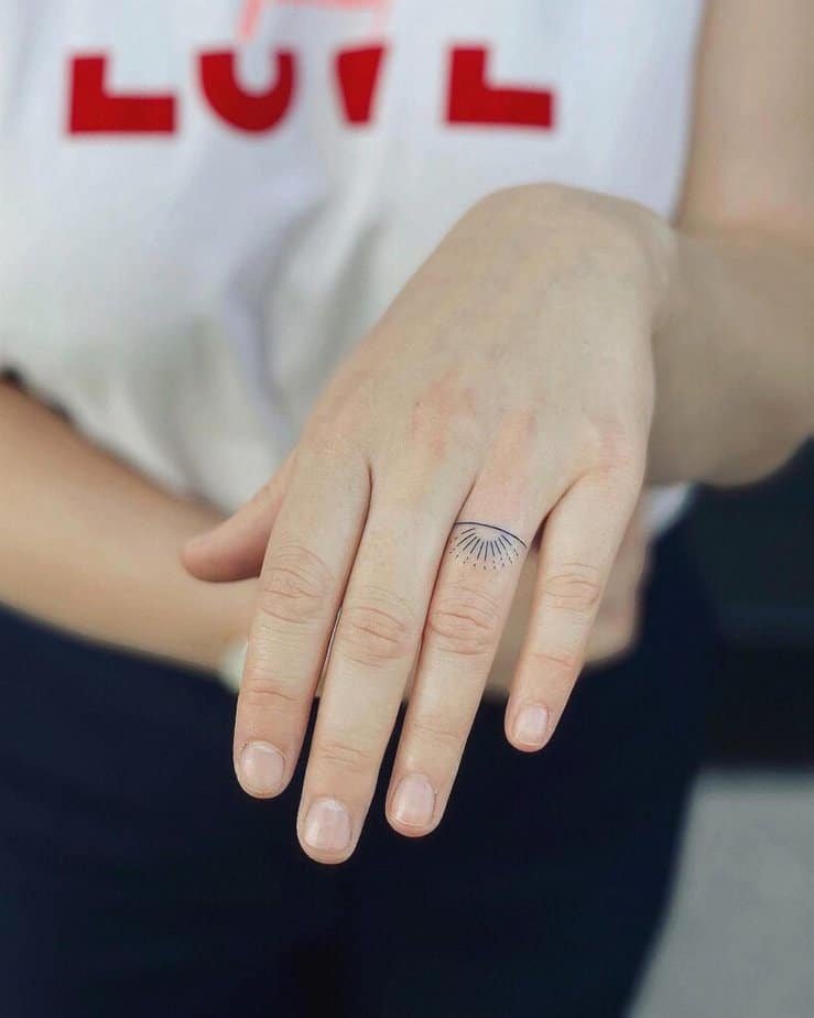 Sun tattoos are lovely for celebrating yourself — they're about light, renewal, and standing back up after hard times. A tiny sun on your ring finger can be a quiet reminder of your resilience and your brightness.