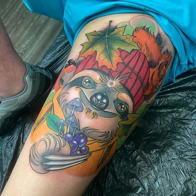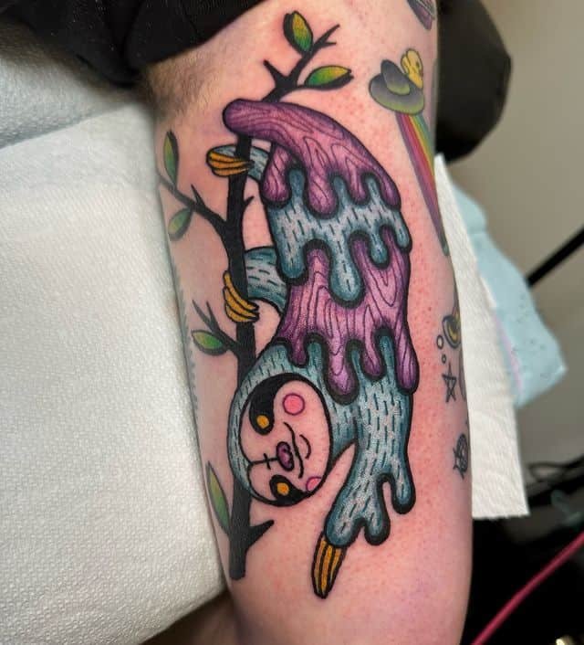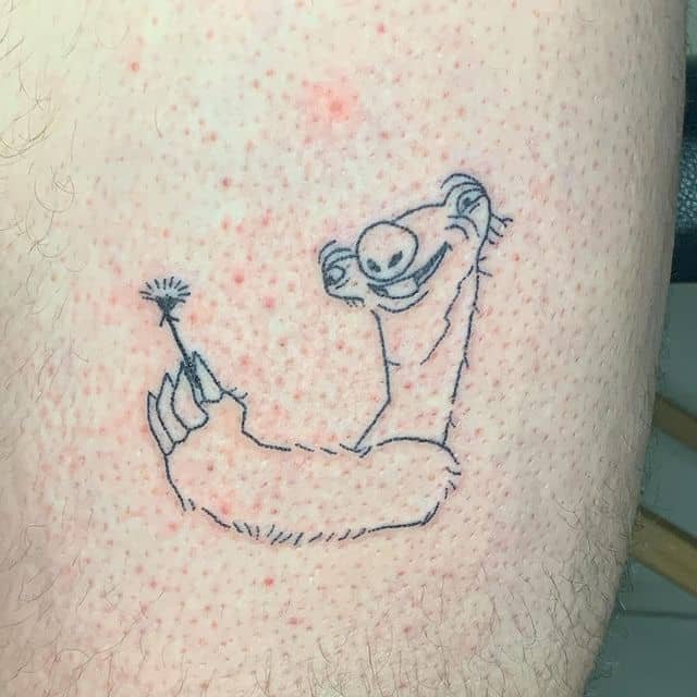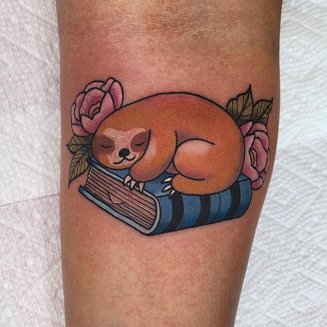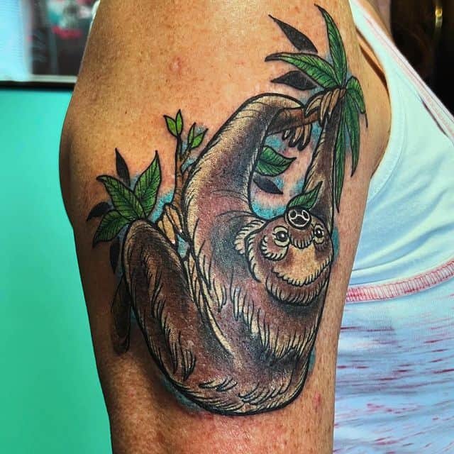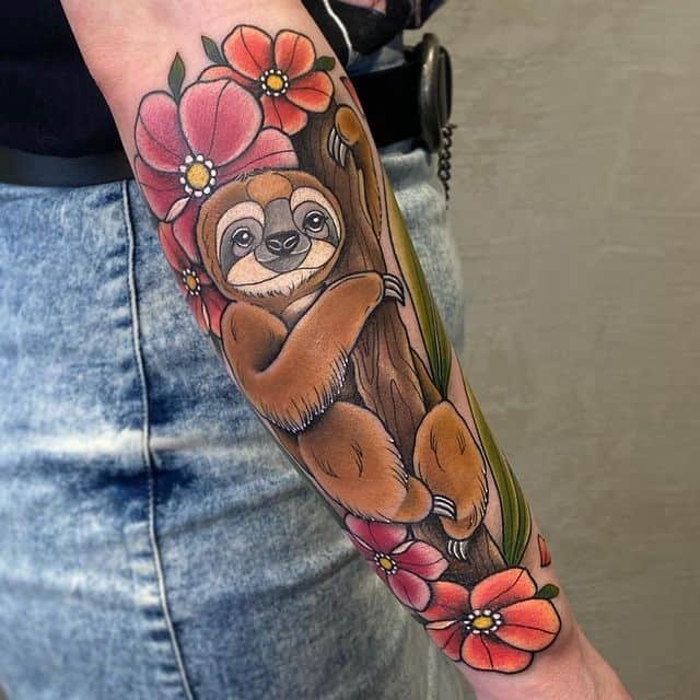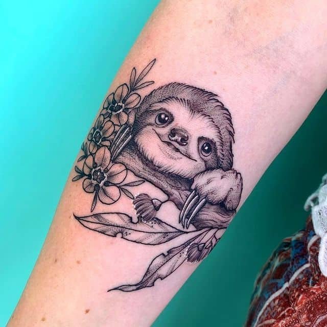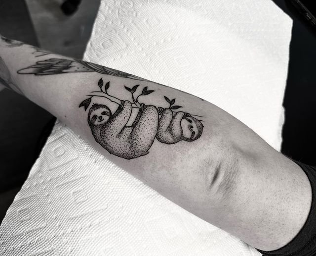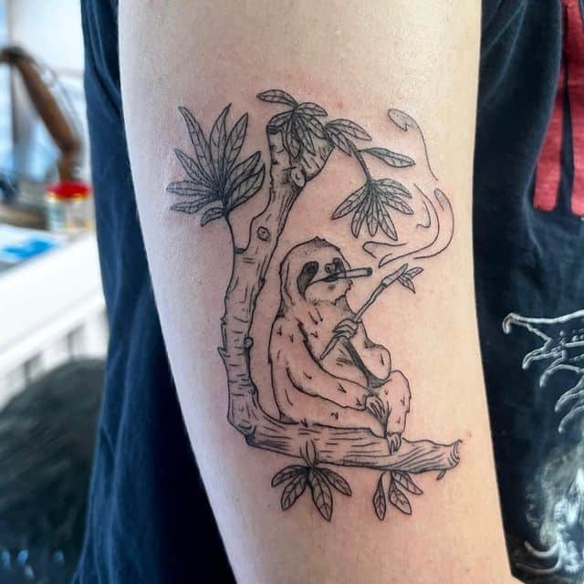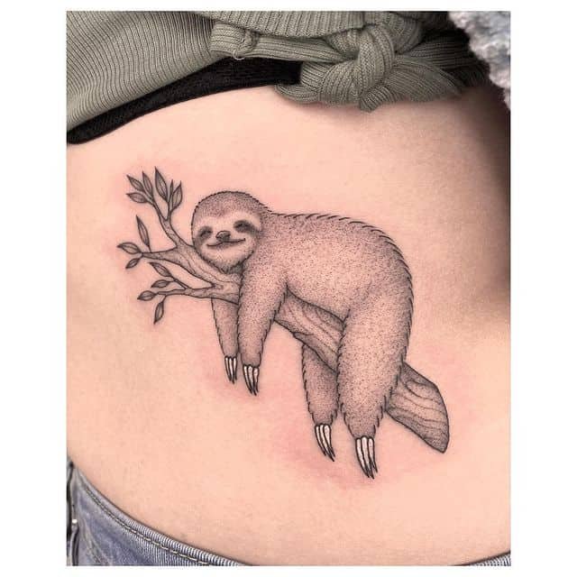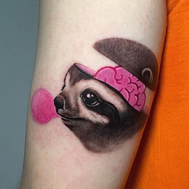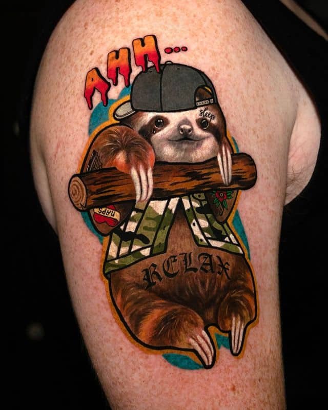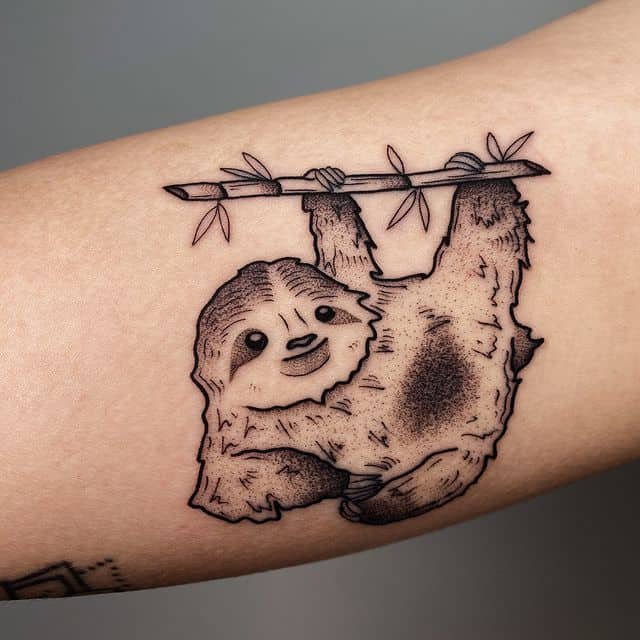 Here’s a sloth that looks like it just finished a little meditation sesh. Eyes soft, posture calm — basically the tattoo version of a deep exhale. It’s a gentle prompt to let go of stress for a minute and focus on the now. I want it inked on my sternum as a life rule.