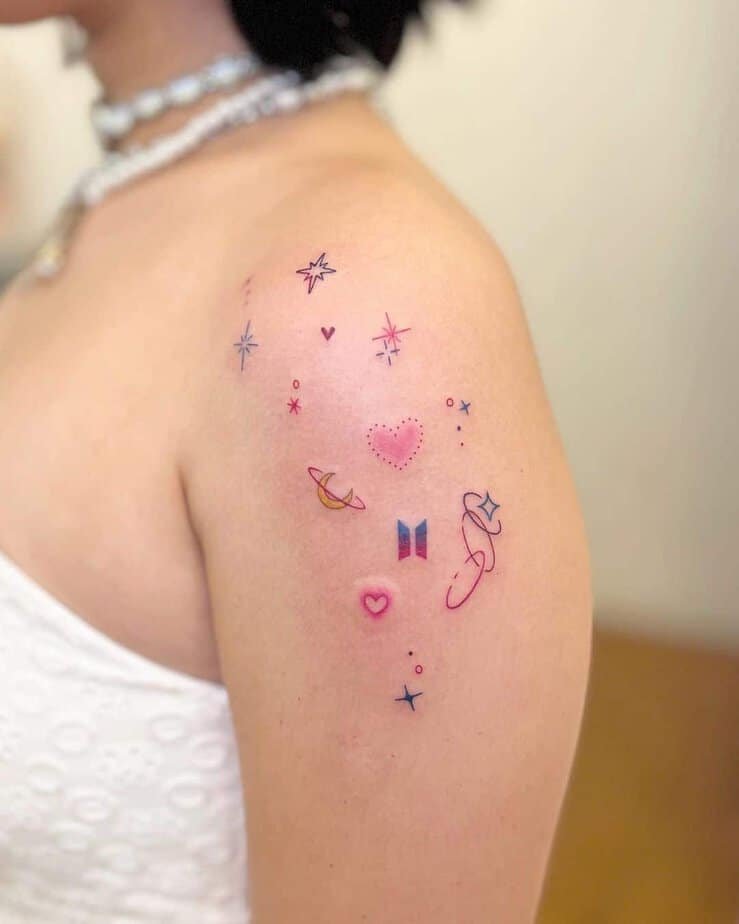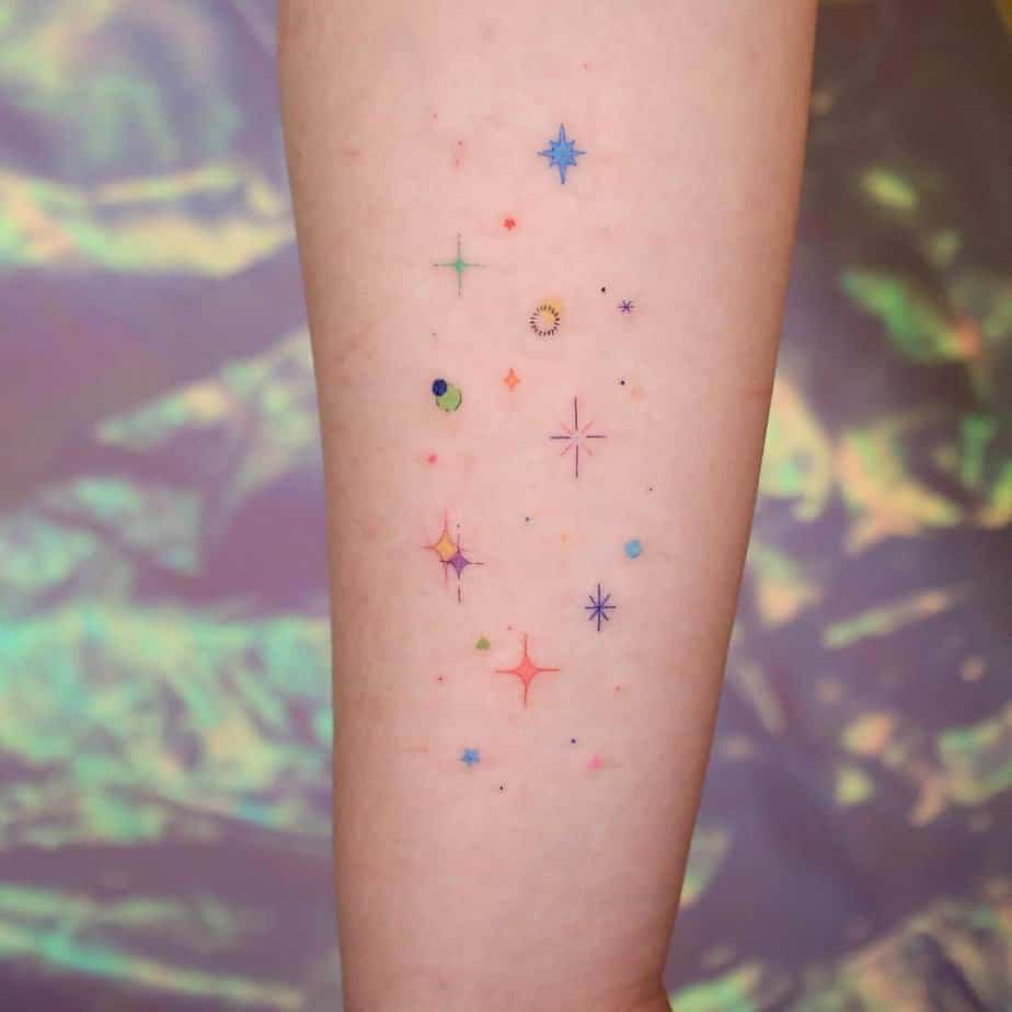 Sticker sleeves love small, simple pieces. Adding sparkles between other mini tattoos pulls the whole look together and gives it a sweet, cohesive vibe.