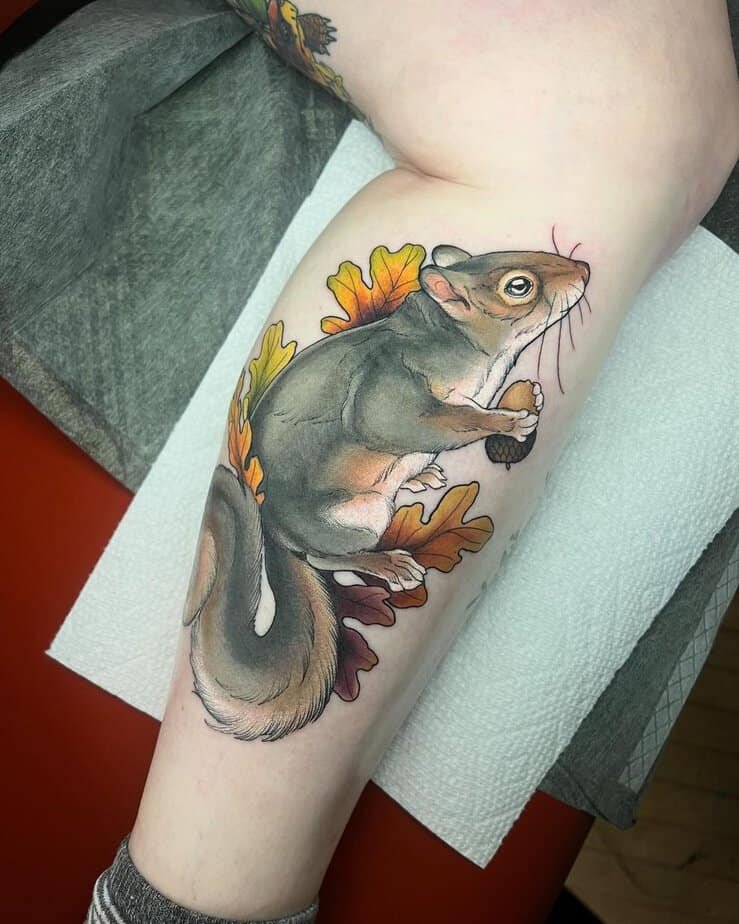 Okay, picture this: a squirrel on your shin, nestled in a tumble of warm, autumn leaves and clutching a nut. It’s bold, colorful, and kind of impossible to ignore. It feels cozy and tender at the same time, like someone captured a quiet fall afternoon and turned it into a little scene on your skin. If you love nature and a pop of seasonal color, this one really sings.