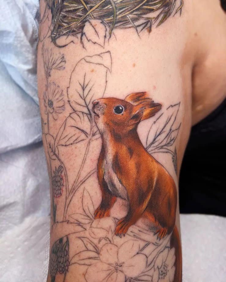 Think sweet and thoughtful: a squirrel perched on a branch, painted with bright colors and a hint of daydreaming. It grows into a half-sleeve and reads as playful elegance — great if you want something that stands out with personality.