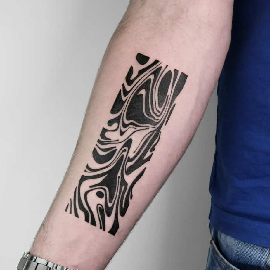 This one hits hard: a black-and-white half-sleeve on the forearm that swirls and dances across the skin like an optical illusion. The deep black shading against bare skin gives it a dramatic punch, so if you want a piece with presence that hugs the arm’s shape, this is it.