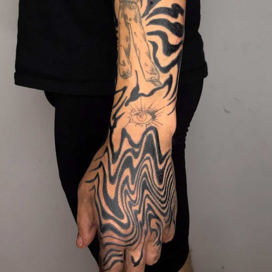 This is the dreamier, stranger cousin of the hand tattoo: distorted lines that bend in unexpected ways and a small surreal eye tucked in the design. It’s like tradition met a lucid dream and decided to stay together. If you love subtle creepiness, you’ll love this.