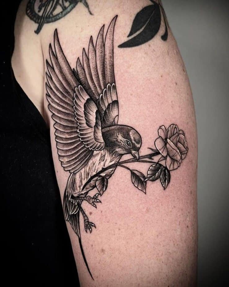 If you want to honor someone, a swallow carrying a rose feels intimate and deliberate. It’s a tender way to keep someone close.