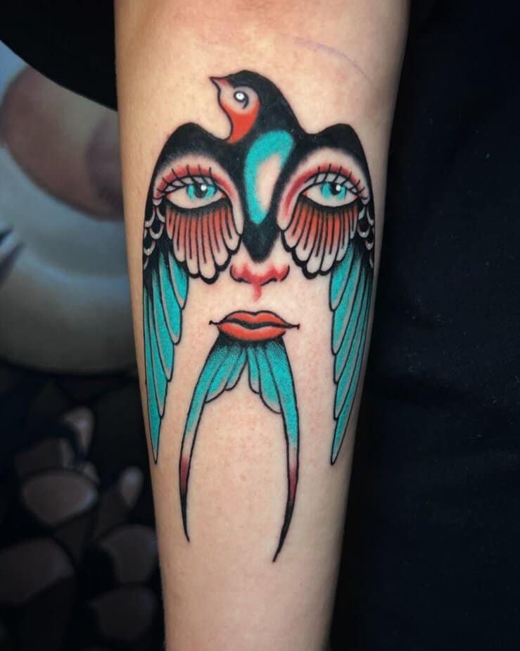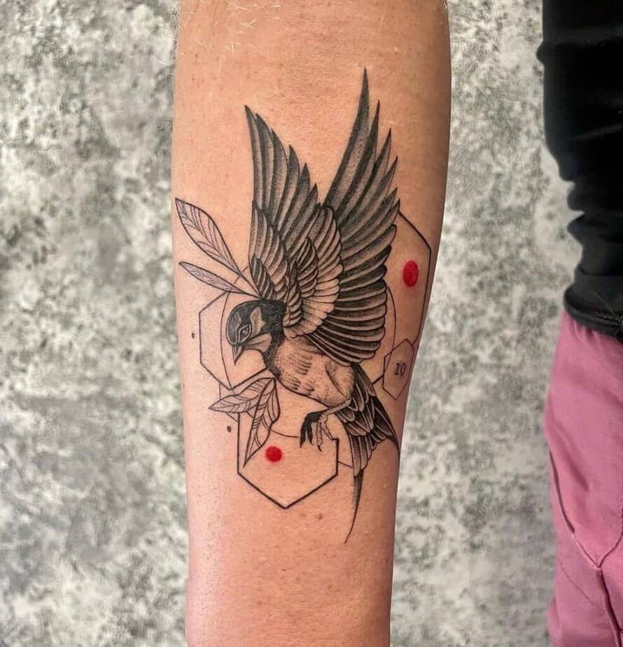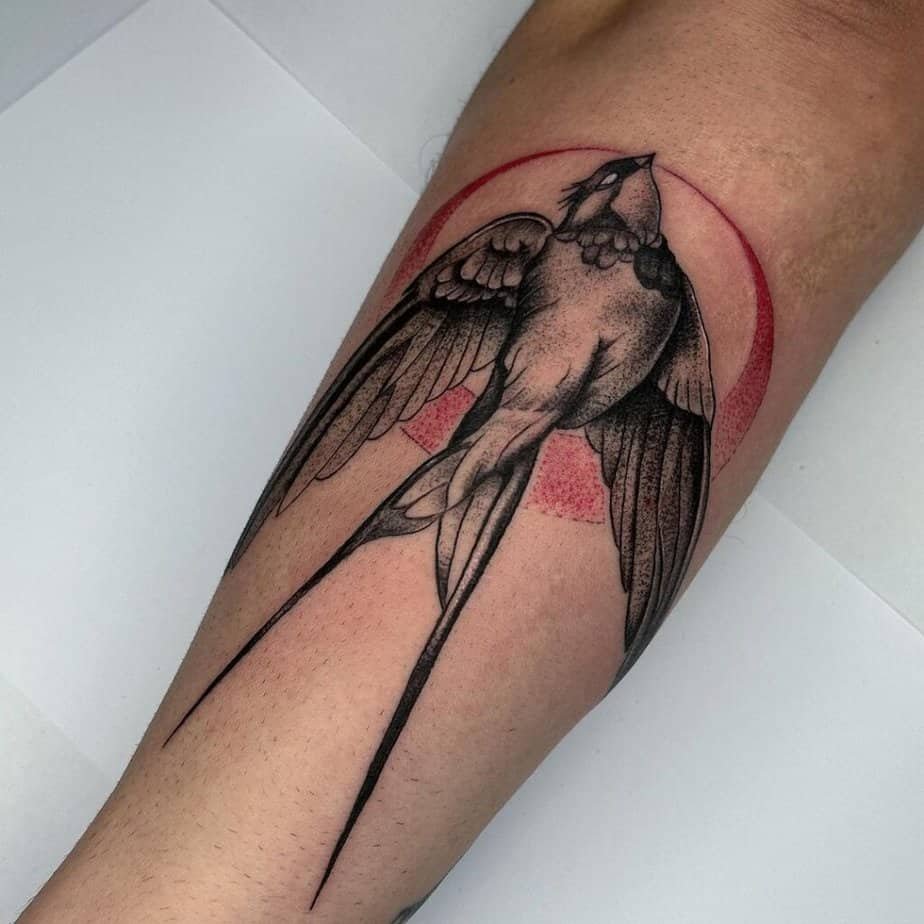 A simple red circle or colored backdrop can make a small swallow feel bold. It’s an easy trick to give a minimal tattoo some drama.
