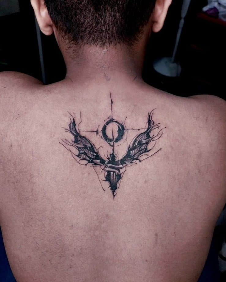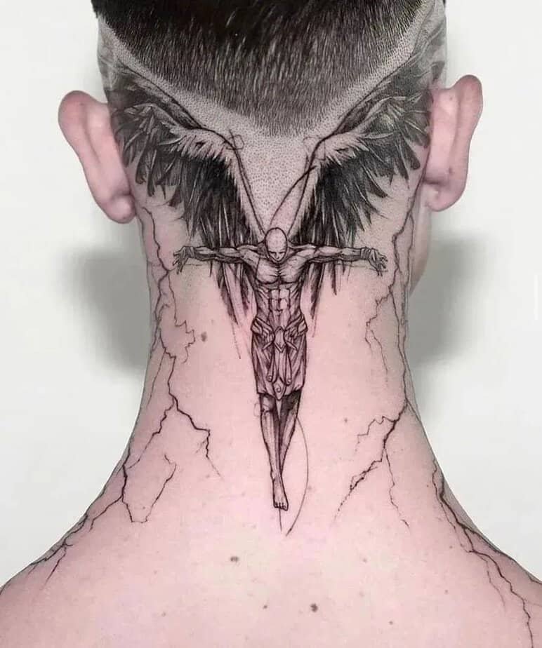 Trap tattoos aren’t just decorative — you can put real symbolism there, too. A fallen angel, for example, can capture complex stories: loss of innocence, hard-won survival, or a personal battle you’ve overcome. Placed near the upper trap and head, it makes the narrative feel intimate and powerful.