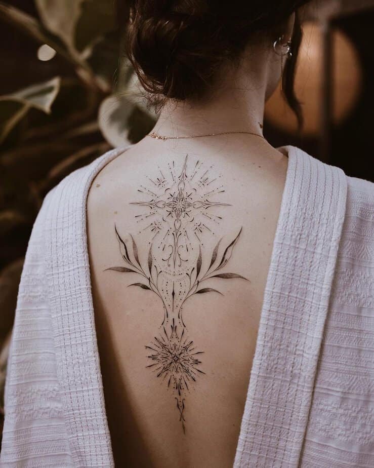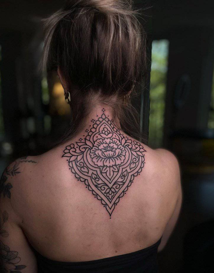 Ornamental tattoos are one of my favorite ways to decorate the trap area because they’re more about beauty than a literal message. You can arrange little ornaments around your shoulders and neck, let them follow the curve of your back, and end up with something that feels custom-made for your body. It’s less about shouting meaning and more about how the pieces move with you — which is kind of the whole point, right?