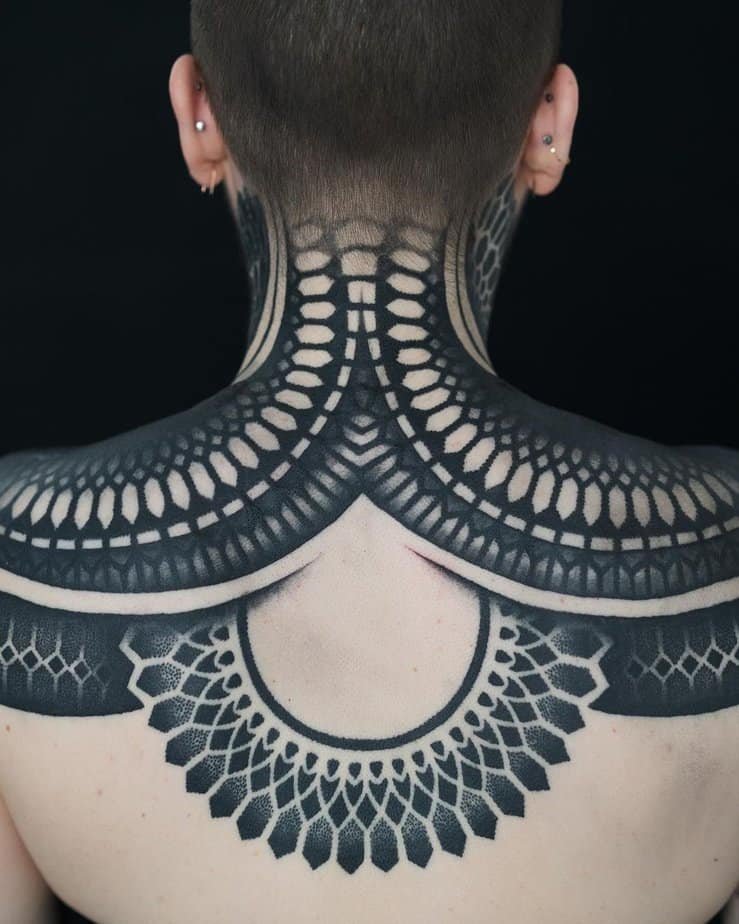 Geometric designs bring an elegant structure to the traps. They’re decorative in a very refined way and look amazing when they follow the shape of your muscles.