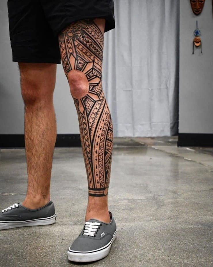This kind of Polynesian composition uses a lot of small patterns to build a larger, flowing design that follows the body’s contours. It takes hours and patience, but the final piece looks like it was always meant to live on your skin.