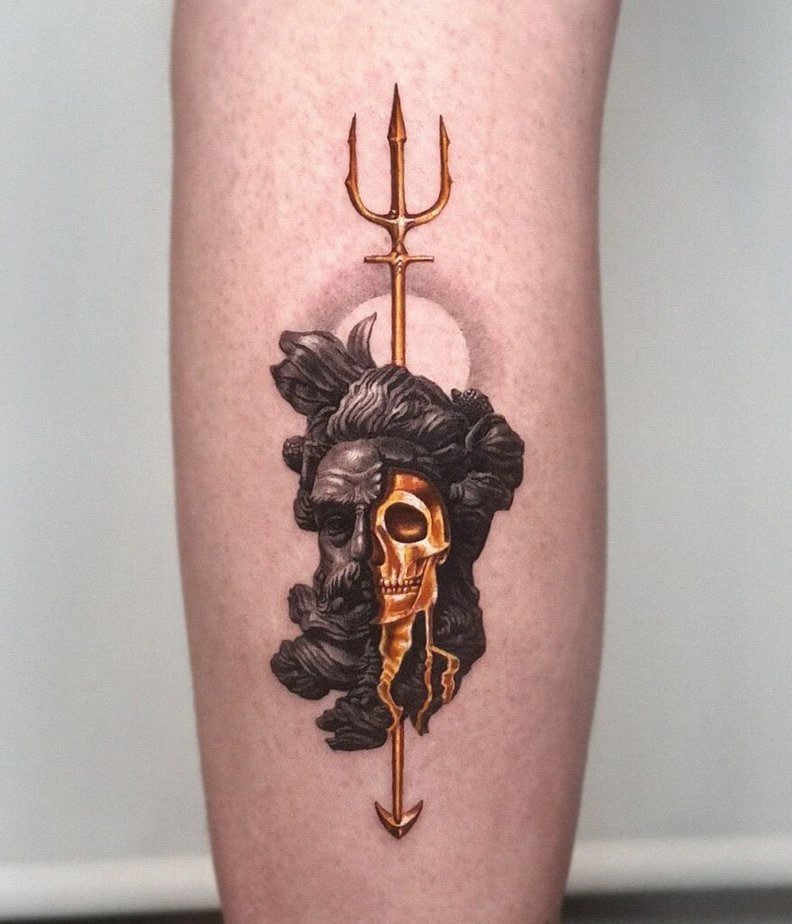 Working in gold tones (or gold-effect shading) gives a trident this regal, shiny look, and pairing it with a skull adds drama. It’s theatrical in the best way — glamorous but a touch ominous.