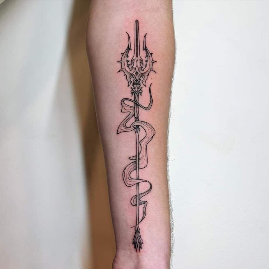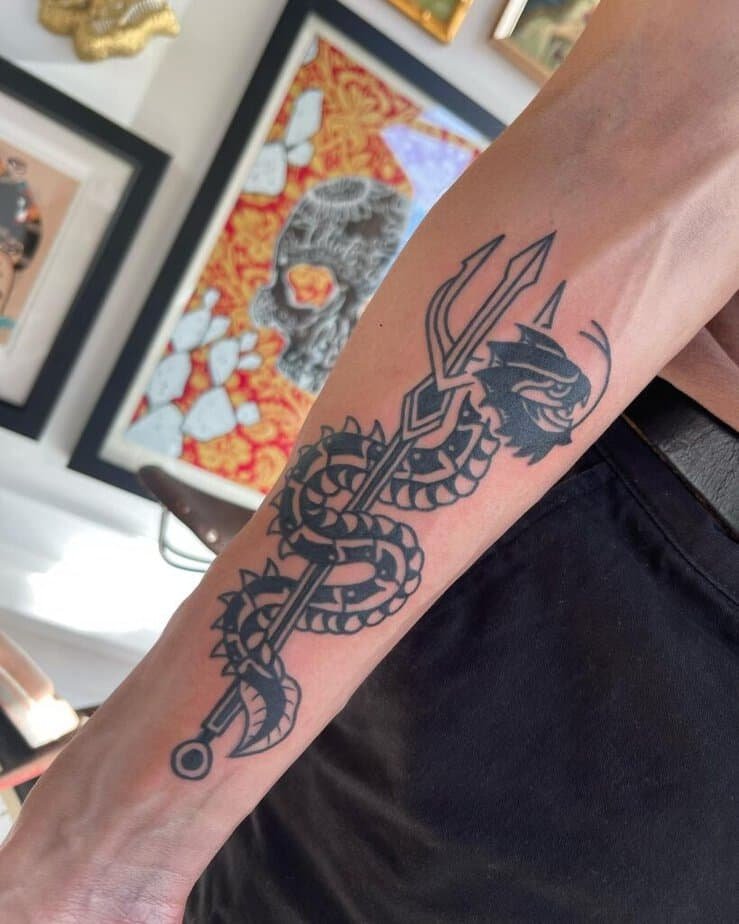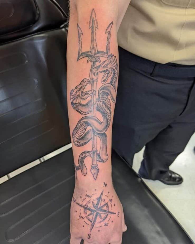 If you like storytelling tattoos, embellish your trident with something wild — a two-headed sea monster, a snake, a fish — any of those will twist the meaning into something more personal and theatrical.