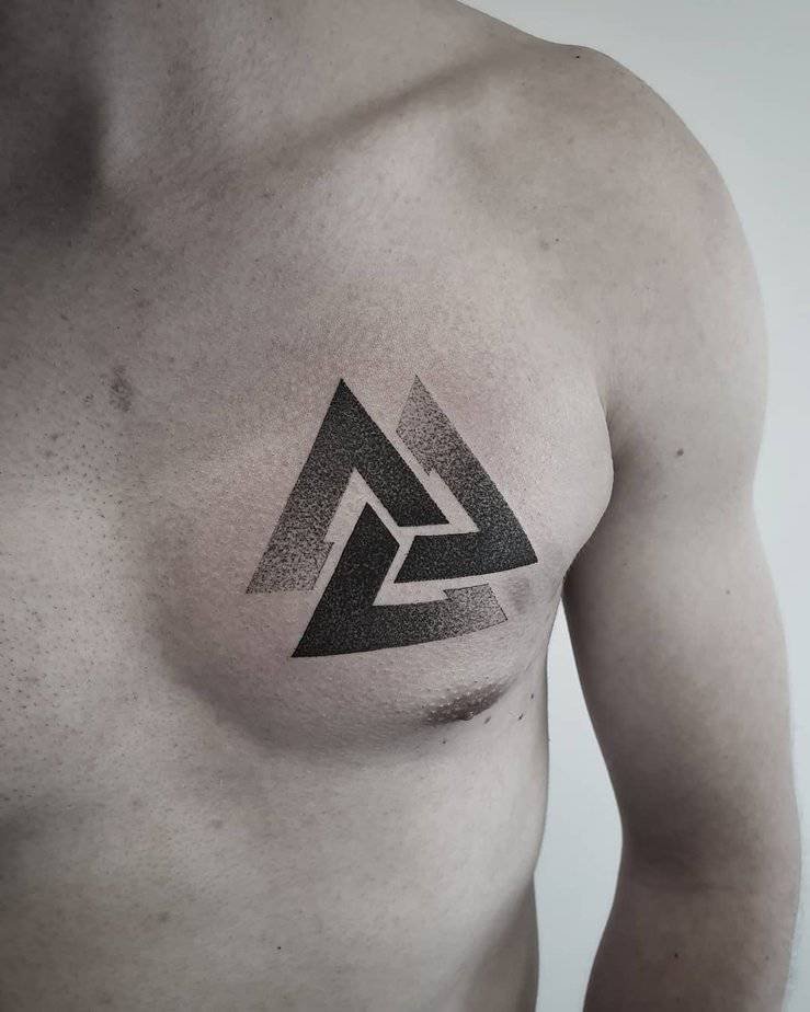 When you want impact, chest blackwork delivers. This kind of Valknut design uses large black sections with muted areas for contrast, and putting it near the heart gives it that extra weight — strength, courage, resilience. It’s the kind of tattoo that feels like armor and a reminder all in one.