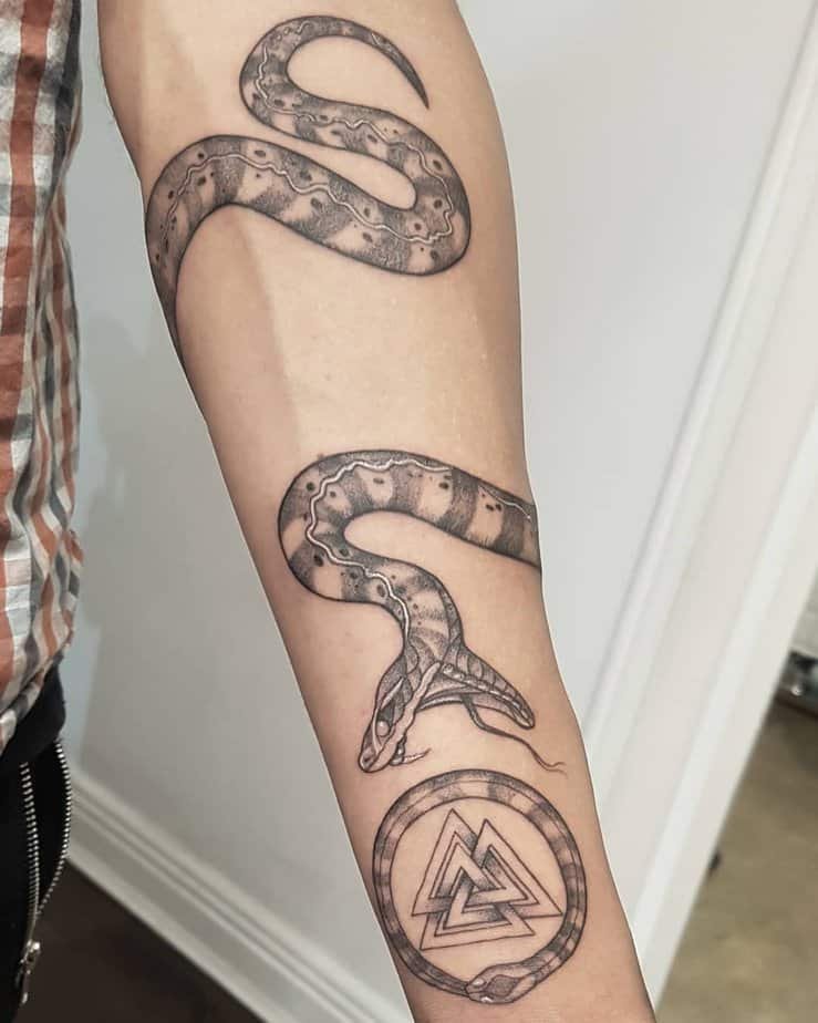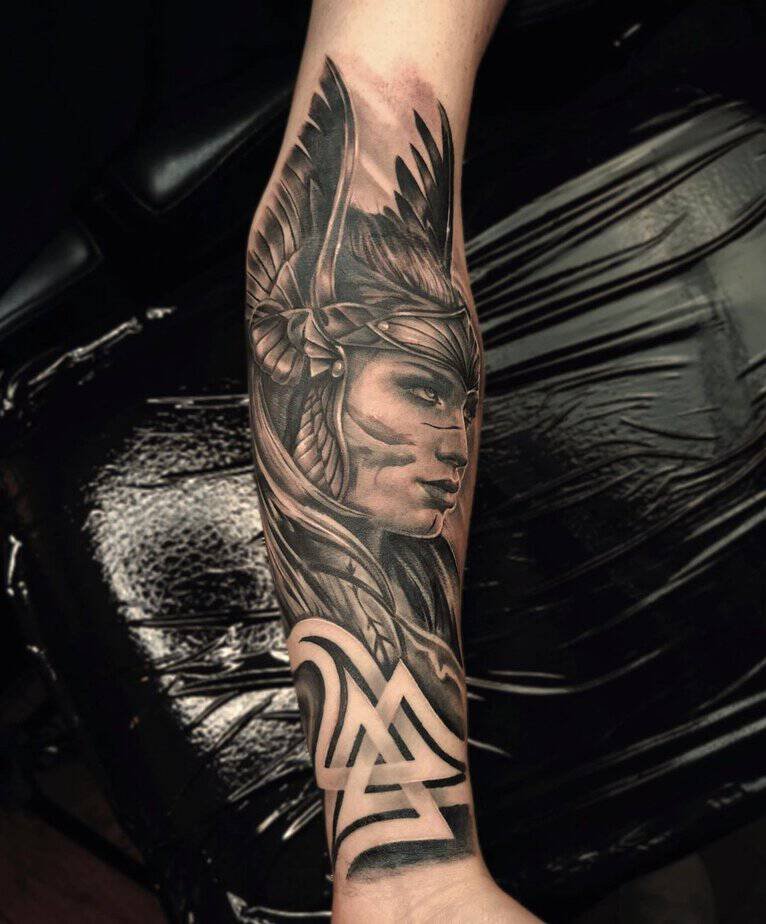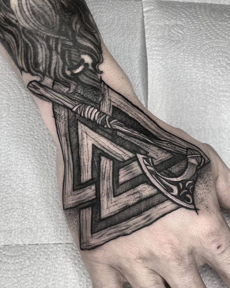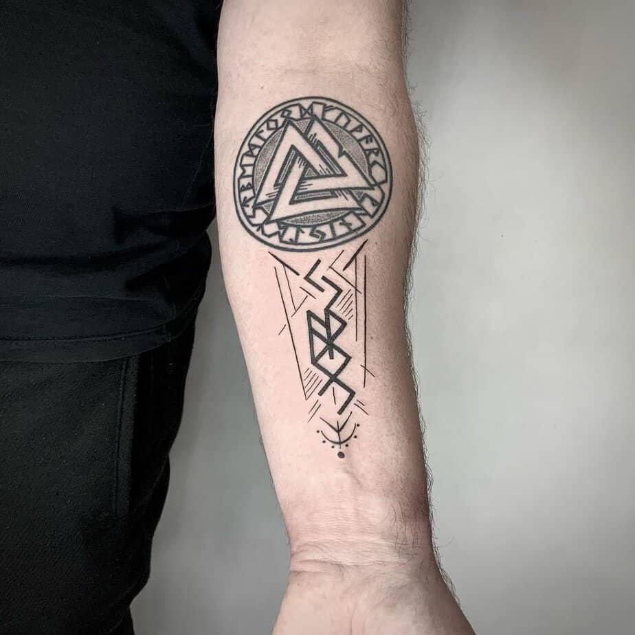 I love when artists mix shapes and meaning. This forearm piece pairs the Valknut with little geometric touches — even pause and play symbols — and that contrast gives it tension. The triangles have always been read as realms, like the living and the afterlife, and when you bring in music icons it adds a layer: pause as an echo of endings, play as the life you keep pressing forward. It’s clever and kind of haunting.