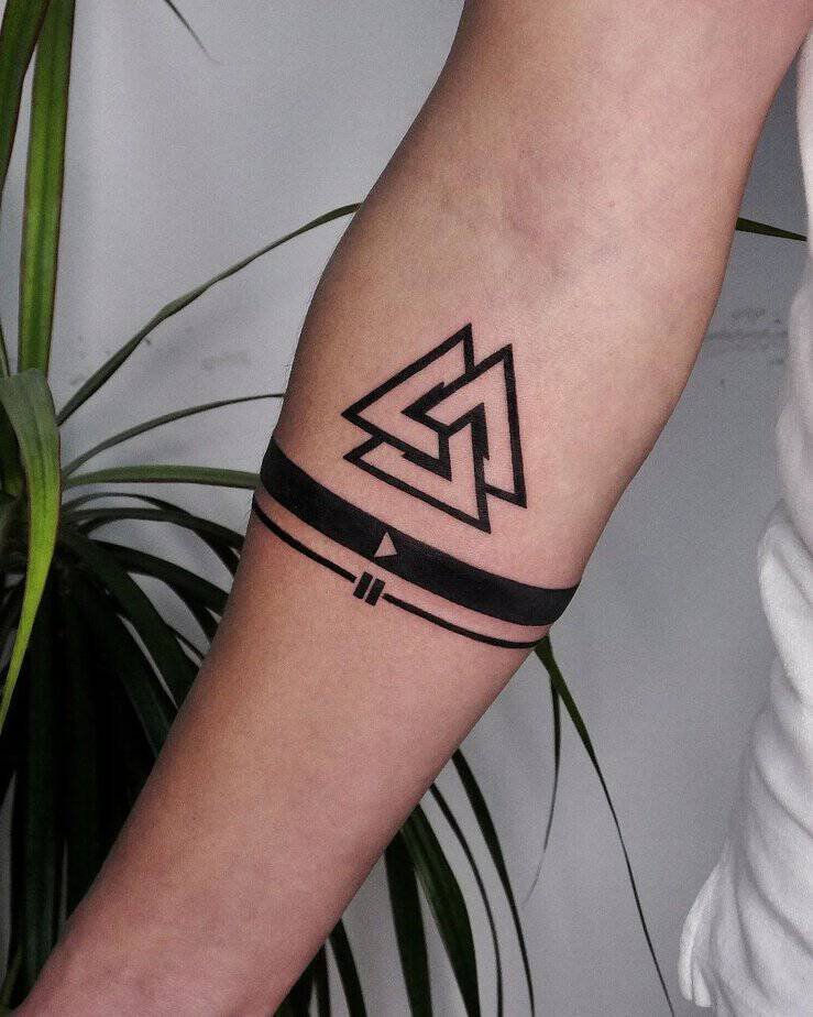 There’s something so satisfying about a small, bold blackwork Valknut on the forearm — it’s quiet but definitely seen. In Norse lore, those interlocking triangles are often called Odin’s knot, and they hint at Odin’s strange ability to mess with fate. If that idea lands with you, this little piece can be a personal reminder that destiny’s messy and sometimes you’ve just gotta let go.
