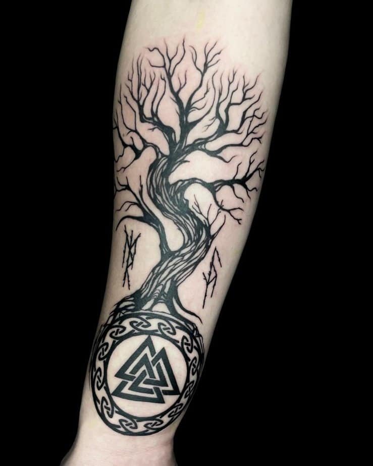 Stacking the Valknut with the Tree of Life and Odin’s ravens turns the tattoo into a full-on Norse emblem. It’s about wisdom, connection, fate — everything the myths orbit around. If you want a piece that feels like a compact story, this is it.