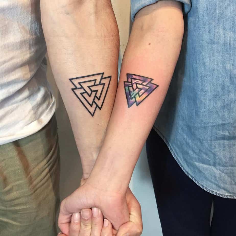 Matching tattoos can be lovely without being saccharine. One of you gets a minimalist black Valknut, the other goes for a galaxy-colored version — same symbol, different vibe. Whether you both lean into color and softer, feminine elements or you keep things stark and black, the point is to pick what feels right together. It’s about shared meaning, not matching Instagram aesthetics.
