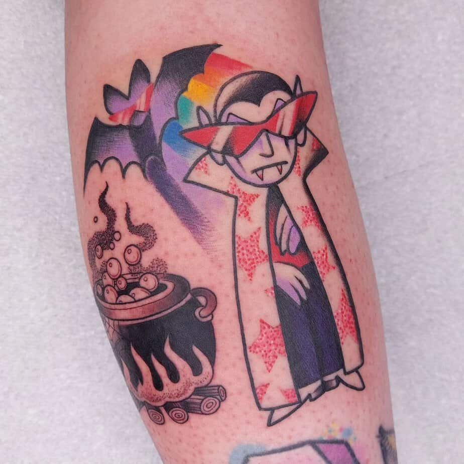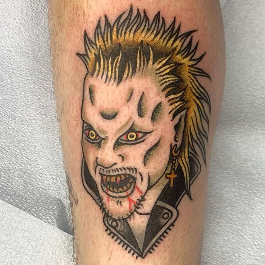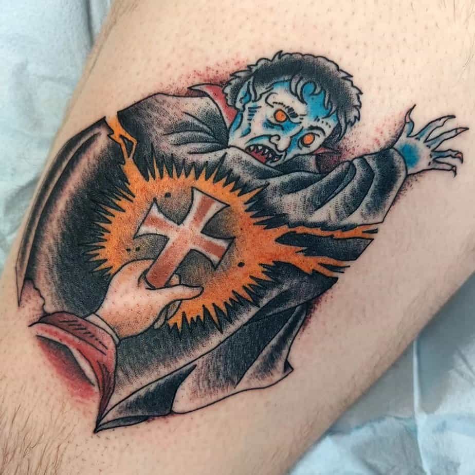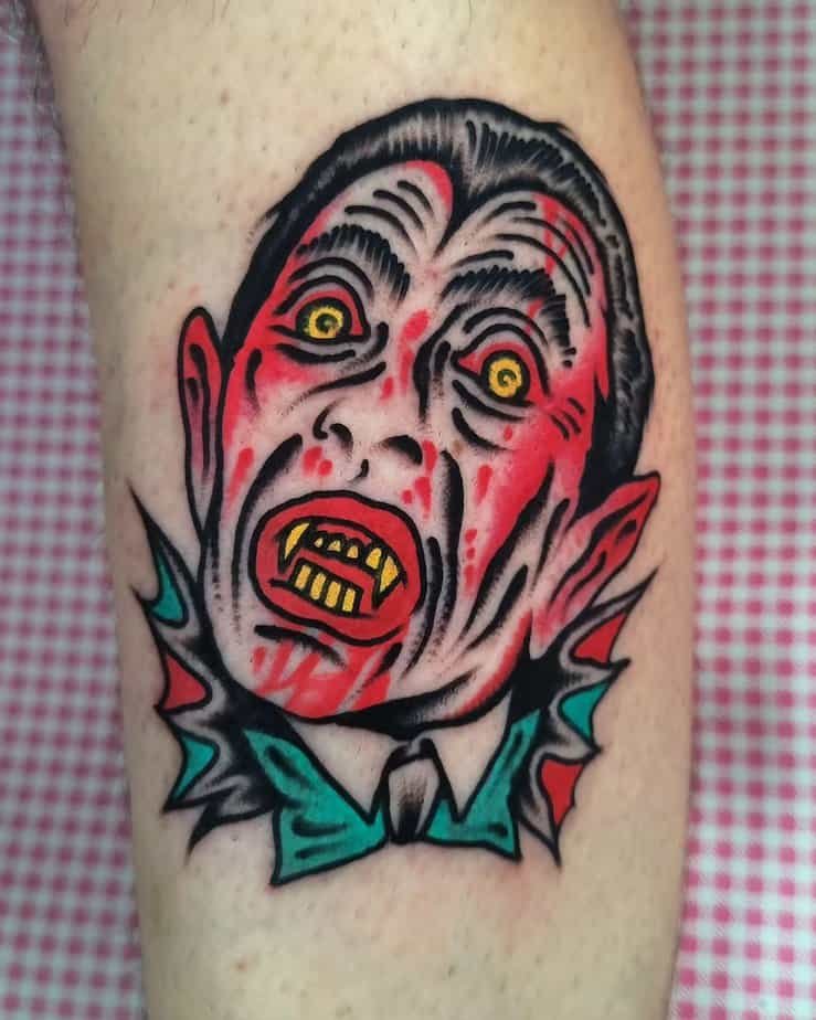 Bold colors, dripping details, and classic horror composition — this is a statement tattoo for anyone who wants full-on vintage terror energy.