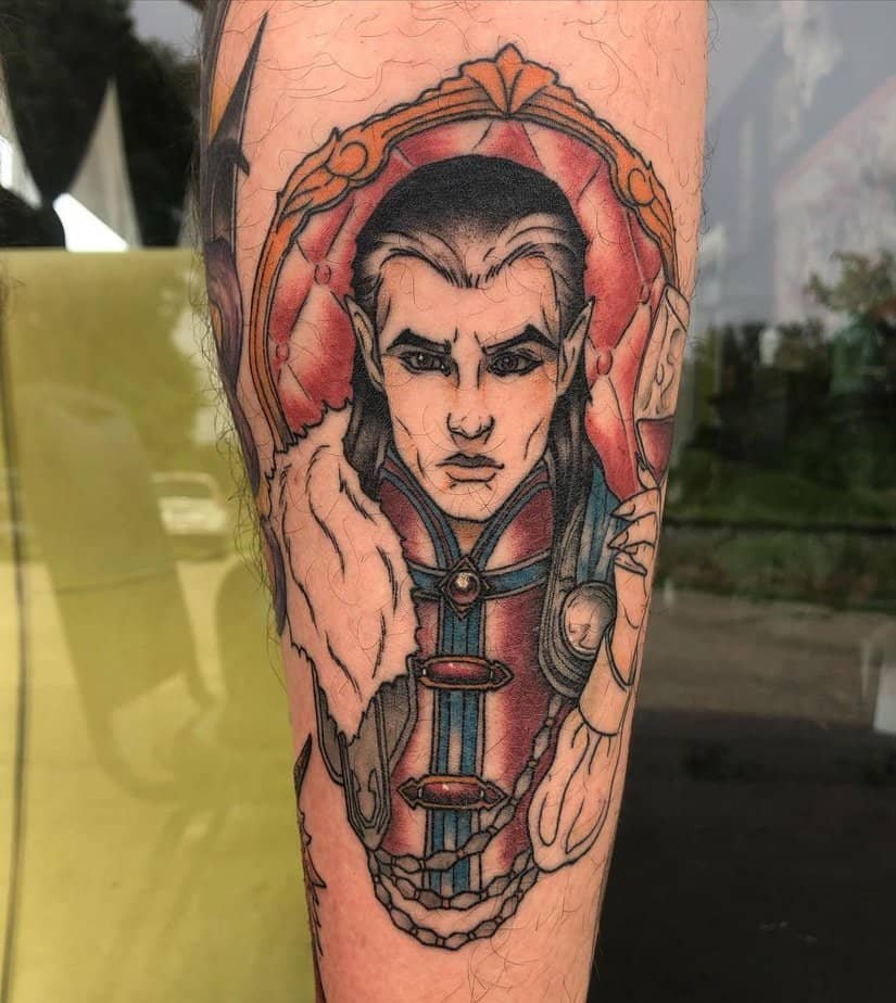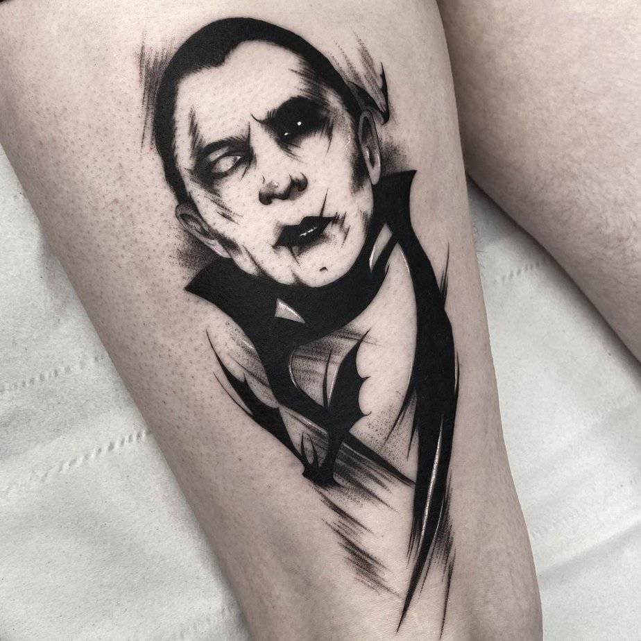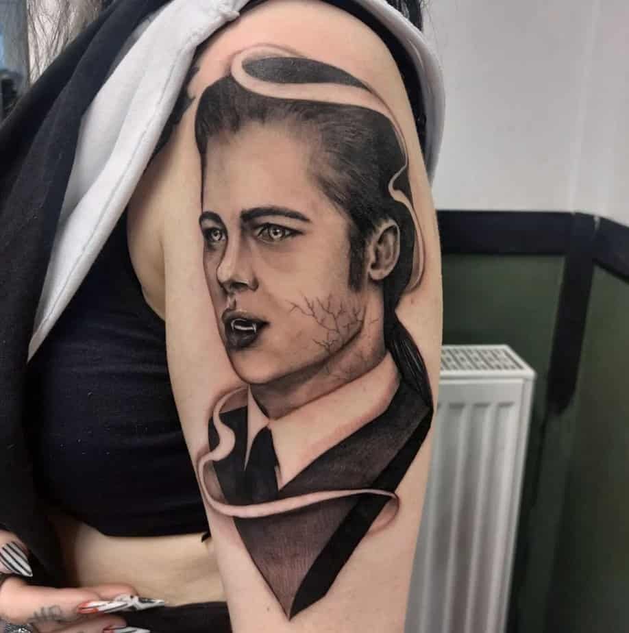 A subtle, realistic portrait that hints at vampirism through cracked skin and an intense gaze — sophisticated and eerie. A beautiful choice if you love film-inspired, lifelike tattoos.