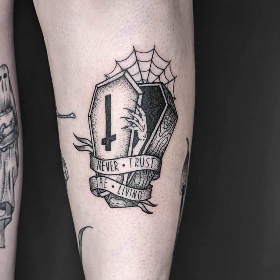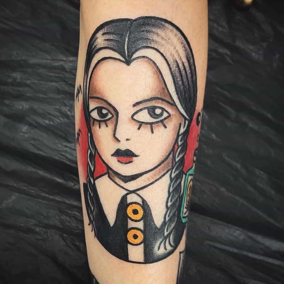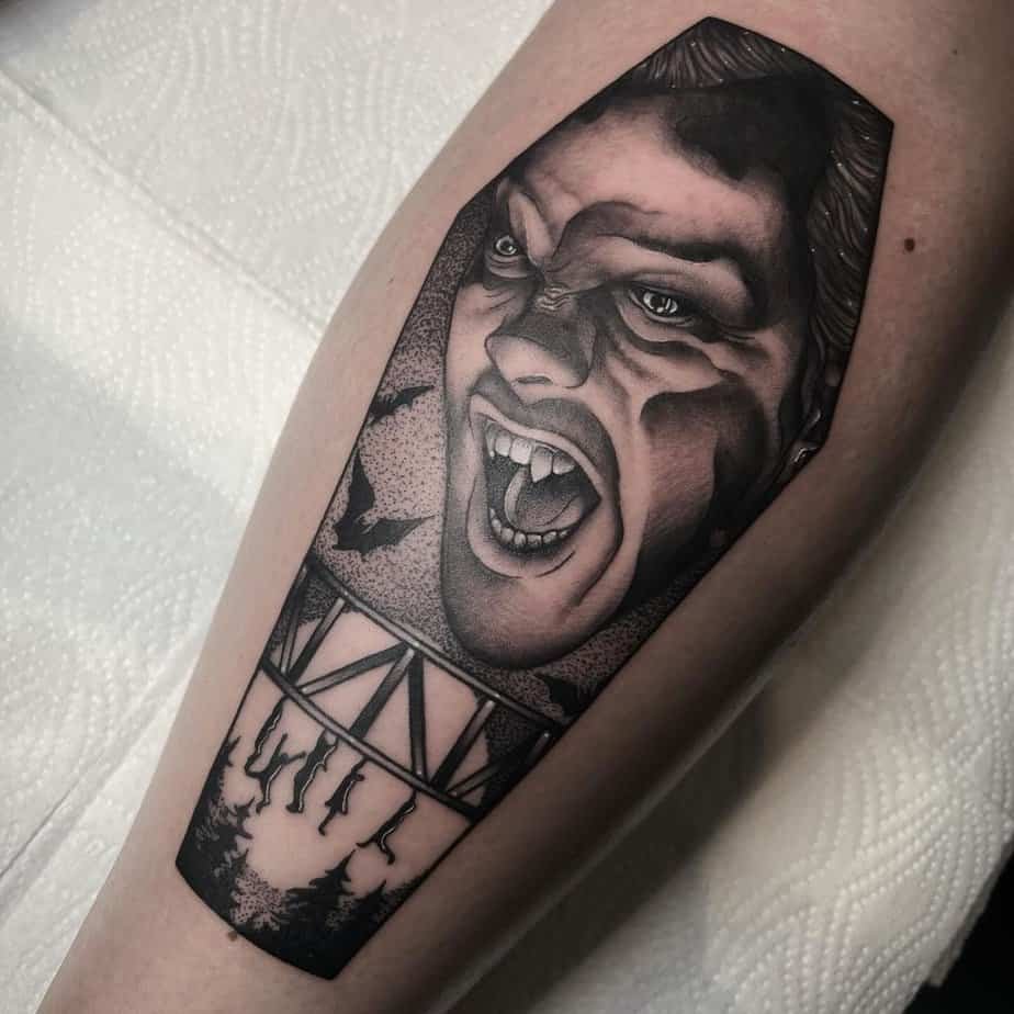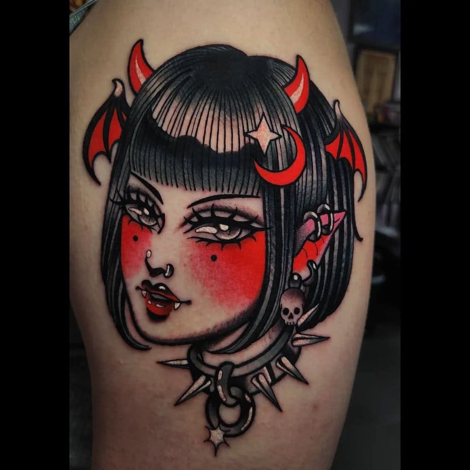 Think classic pin-up energy but with dripping blood and a sly smile — gorgeous and slightly twisted. It’s the kind of tattoo that pairs beauty with horror in a way that feels totally wearable.