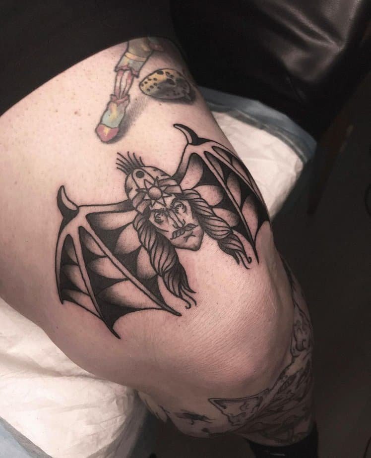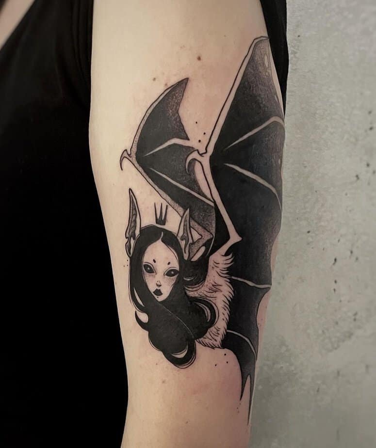 Combining warrior aesthetics with bat wings makes for a heroic, dark fantasy piece. The linework tends to be gorgeous here — great for sleeves or a bold back piece.