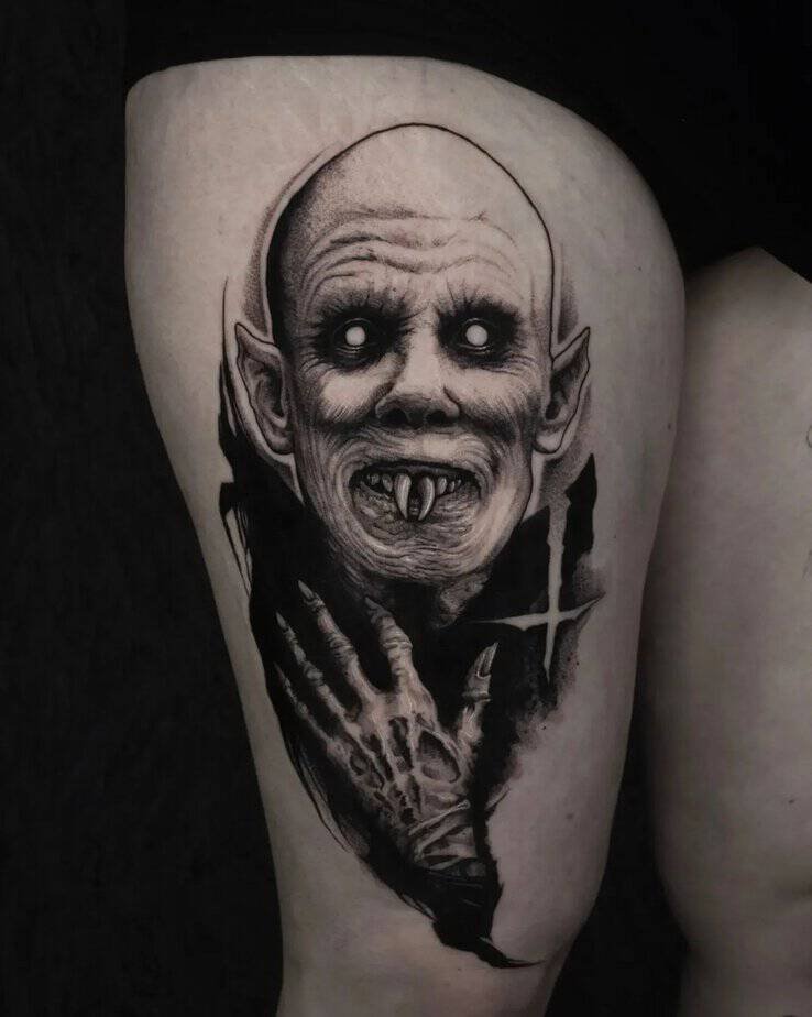 This minimalist Nosferatu keeps things stark and powerful — lots of shadow, haunting stare, and vintage creep. It’s a respectful nod to vampire roots.