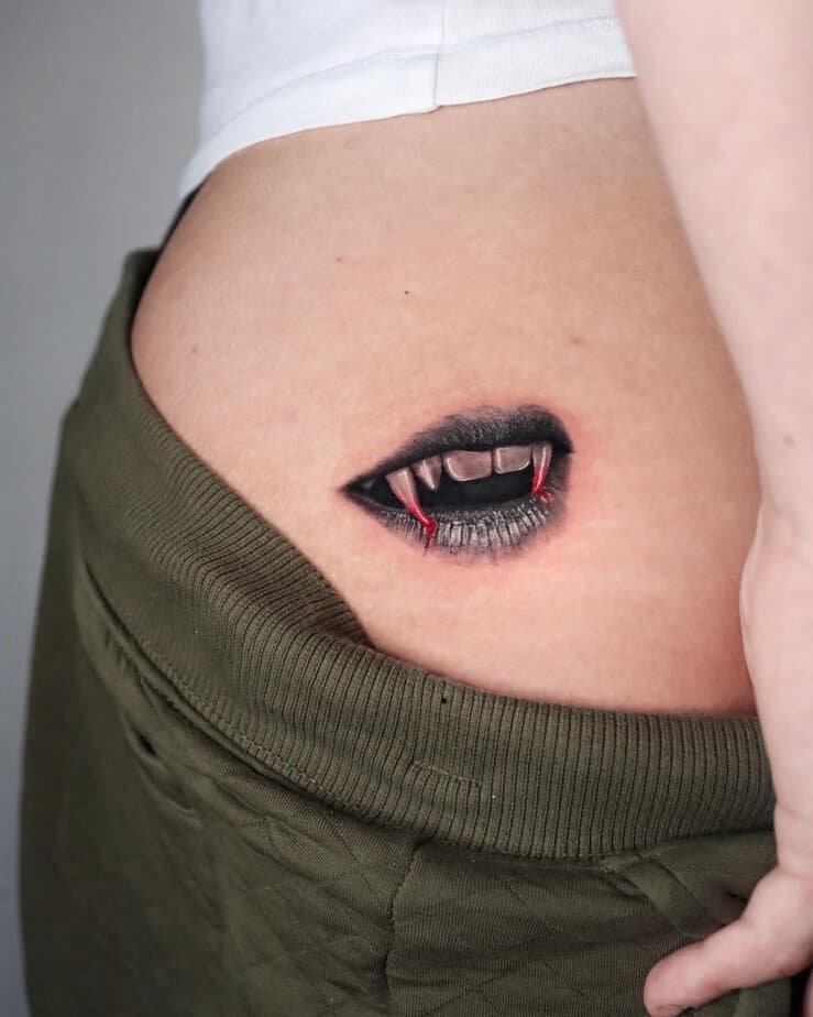 This one makes me smile. A subtle peek of fangs under a waistband is flirty and playful — sexy without screaming for attention. If you want vampiric flair with a wink, this is it.