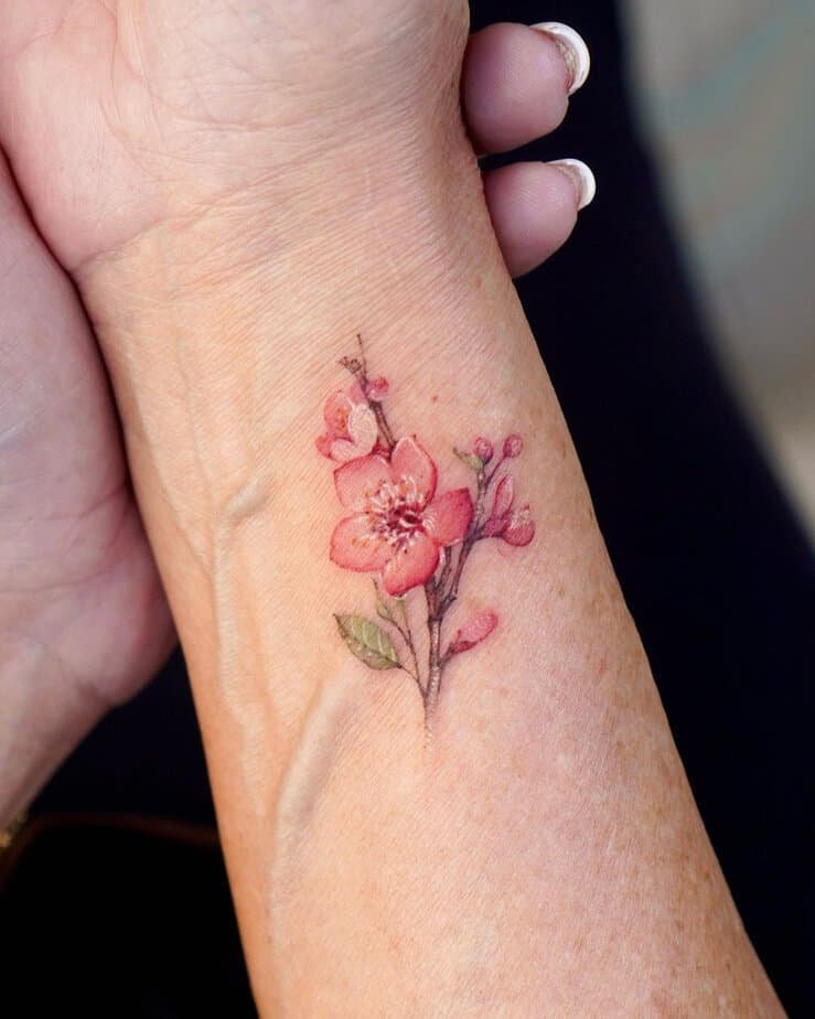 I love cherry blossoms on the wrist because they look delicate but mean so much — renewal, femininity, and that gentle reminder that life is beautiful and temporary. Picture soft pinks blooming across your wrist; it's colorful and charming, but also quietly powerful, like carrying a little promise of perseverance with you.