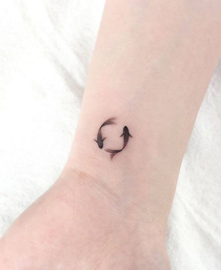 This one’s just adorable: two tiny fish circling each other in delicate blackwork. It reads playful and feminine, but there’s depth too — fish often stand for resilience and the ability to move through tough currents. Cute and meaningful? Sign me up.