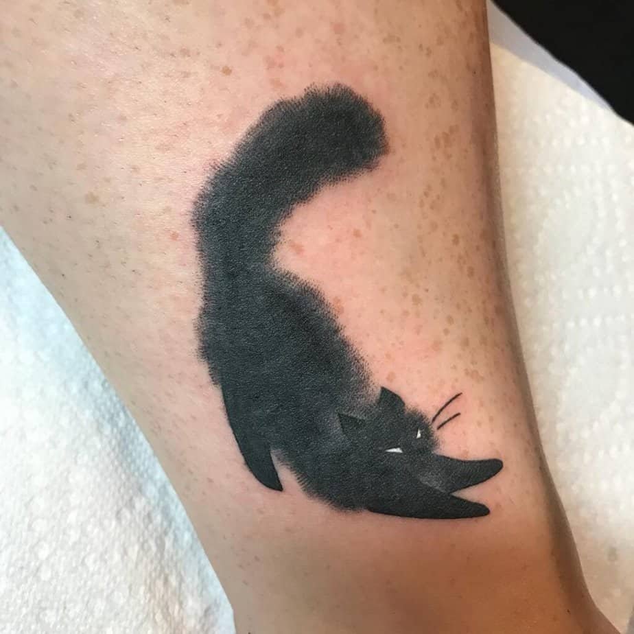 This one totally captures that iconic cat moment — mid-stretch, tail up, kind of smug and absolutely elegant. The fluffy fur details make it feel soft and touchable, so it’s perfect if you want a tattoo that’s playful but still cozy. It’s like wearing a tiny, forever-stretched buddy on your skin.