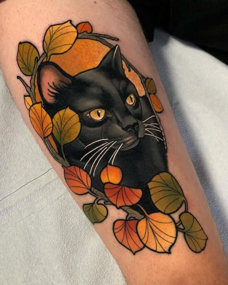 Warm tones, crunchy leaves, and a little cat enjoying the season — this tattoo is like a wearable fall postcard. It’s cozy, seasonal, and perfect if fall is your forever mood. Also, it screams “I am fall,” in the best way.