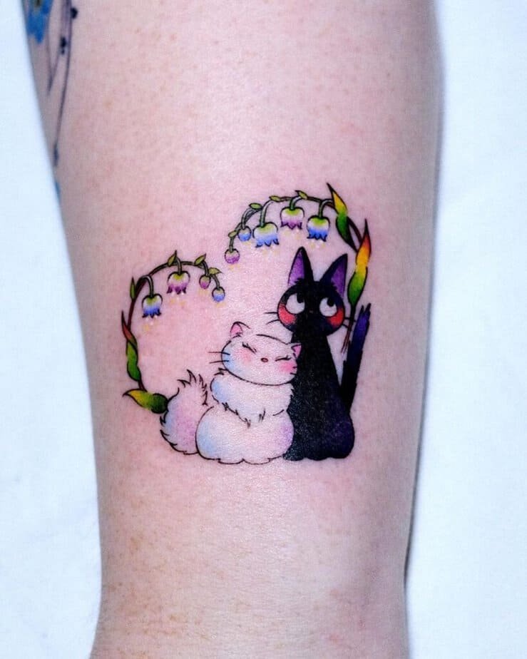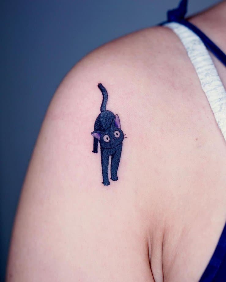 If you’re a Studio Ghibli stan (who isn’t?), a tiny Jiji tattoo is pure nostalgia and sweetness. Big eyes, delicate lines, and soft shading that gives it a little 3D life — it’s adorable on a shoulder or arm. Honestly, it’s like carrying a pocket of movie-magic around with you.