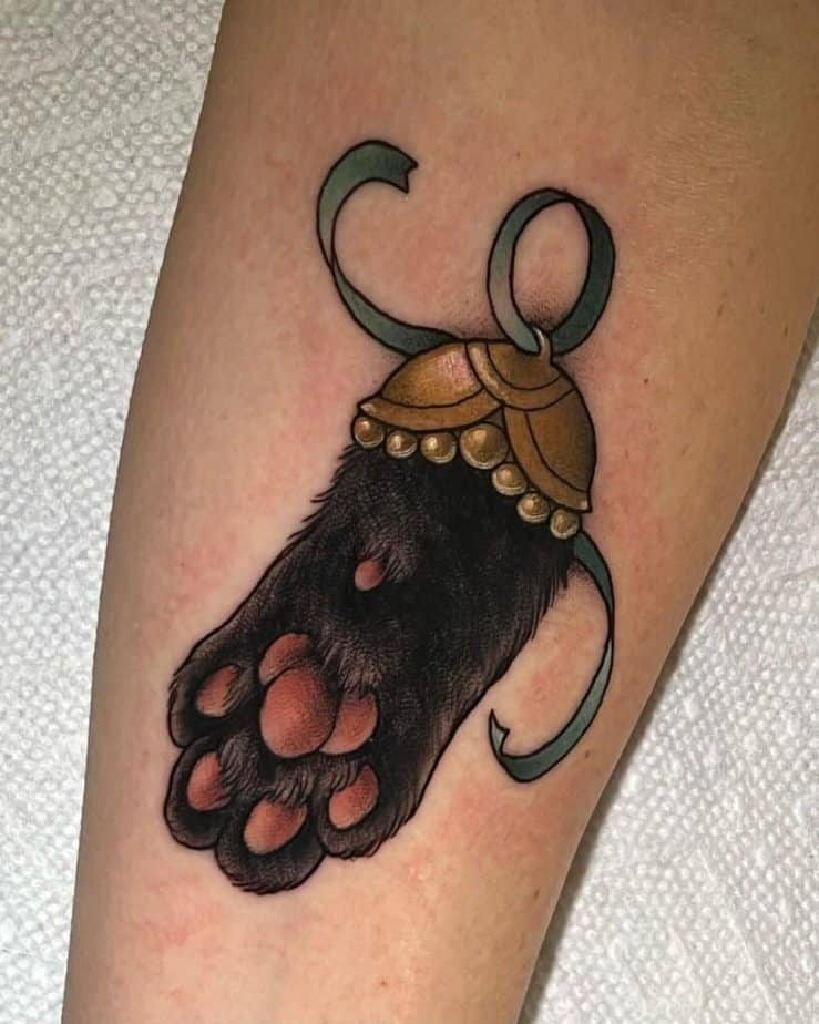 This one’s such a sweet twist on a paw tattoo — add a shiny golden bell and suddenly it feels magical, like a charm. The metallic shading pops against the soft paw fur, giving it a classy-but-playful vibe. It’s luck, elegance, and a little mystery all rolled into one.