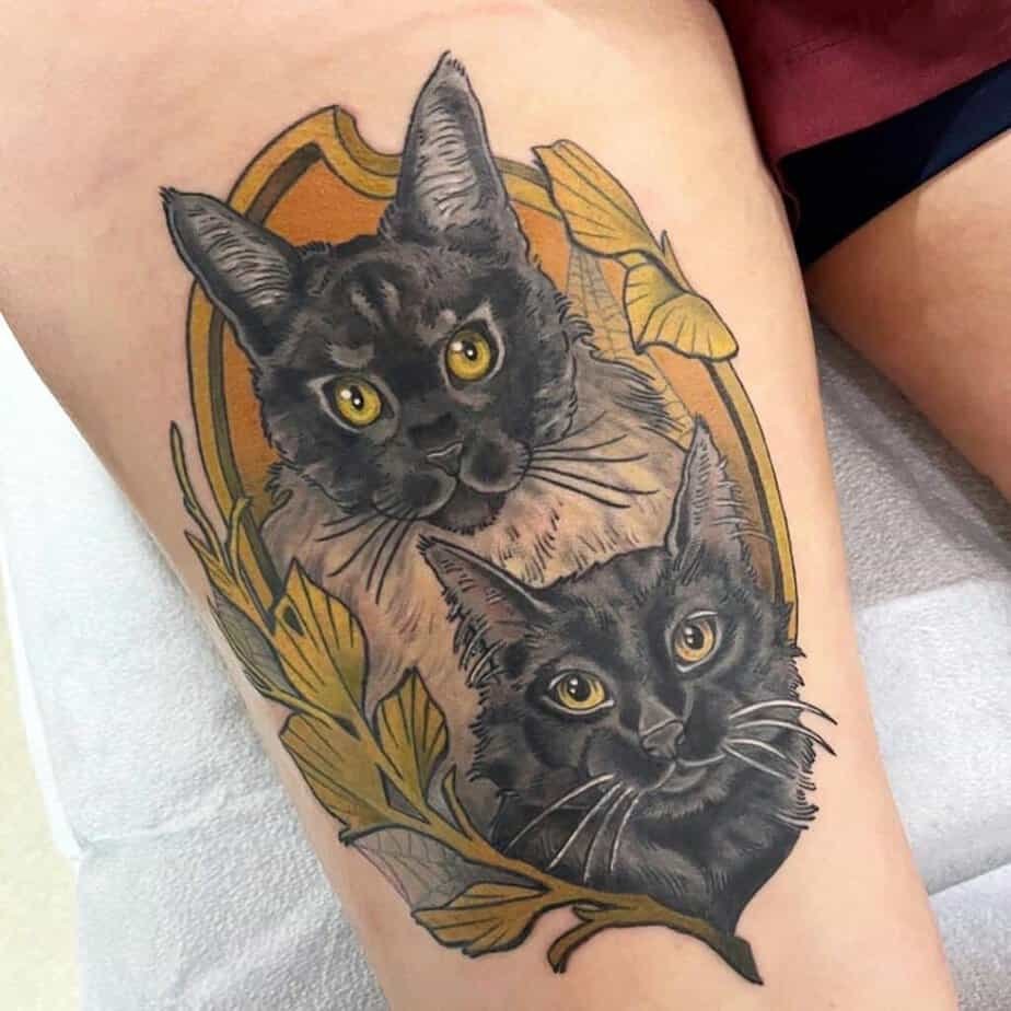 Two sleek kitties with intense yellow eyes — this one’s dramatic and beautiful. The contrast of dark fur and bright eyes gives it a cinematic feel, like they might blink and come to life. Great if you want depth and a bit of story in your tattoo.