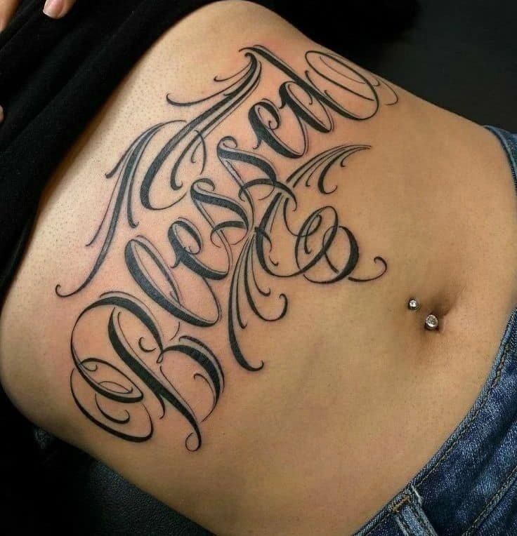 If minimalism isn’t your thing, go big. Think chunky letters with lines and shading that make the word literally stand out from your skin. Some fonts even read like thorns — raw and tough, which can feel powerful when you want that edge. The abdomen or ribs give you space for more artistry: swirls, outlines, and shading that turn the lettering into a piece of its own. Gothic fonts on the ribs? Totally cinematic — it reads like a statement.