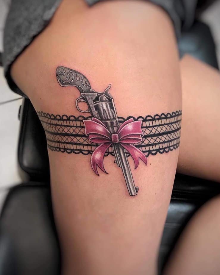 This one mixes a bold gun motif with a dainty bow and ornamental garter details. The gun gives a fierce edge, the bow brings softness, and the pink, black, and gray tones tie the whole thing into a balanced, nuanced statement about the many sides of you.