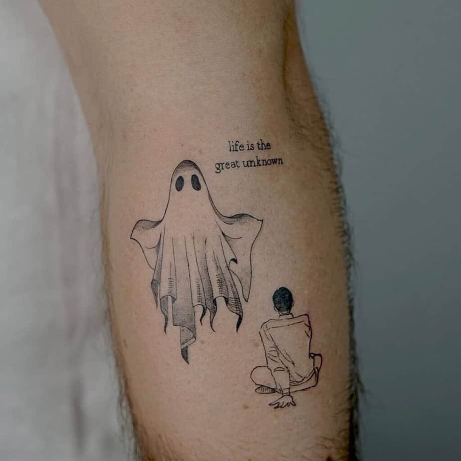 I’m here for a tattoo that comes with a little phrase. This ghost paired with “life is the great unknown” feels thoughtful, a gentle reminder that we’re all figuring it out. It’s both whimsical and kind of philosophical.