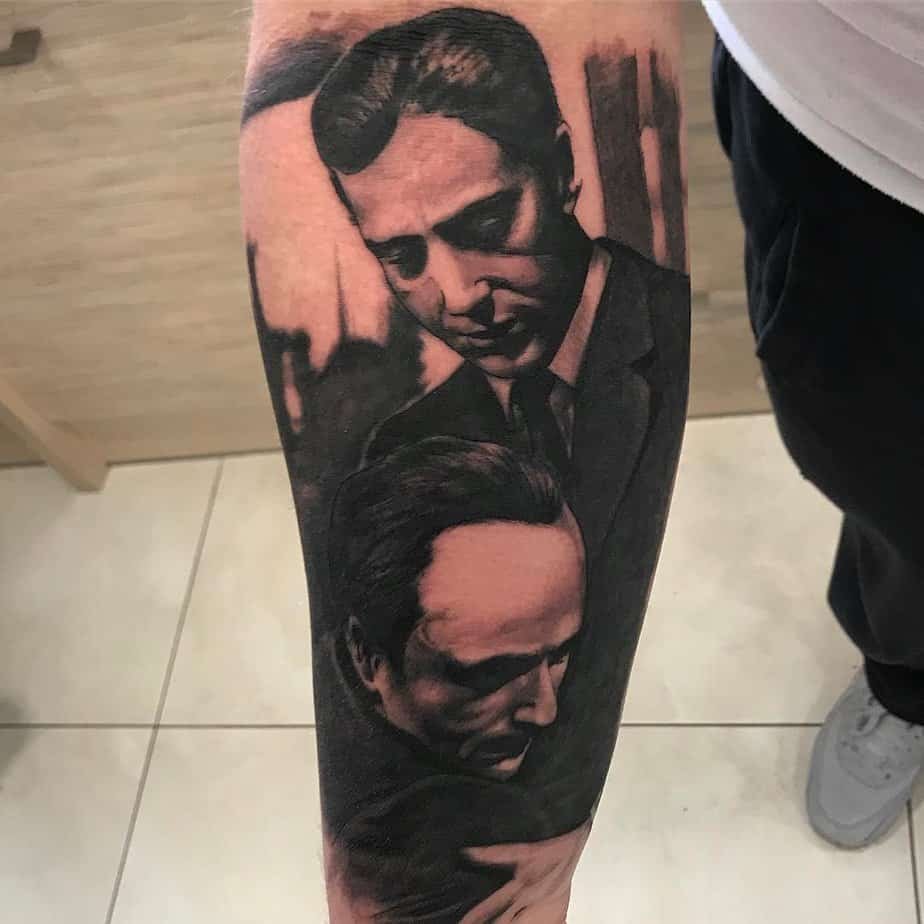 This thigh piece frames the intense relationship between Vito and Michael with a dramatic background that adds depth. It’s emotional, complex, and beautifully done.